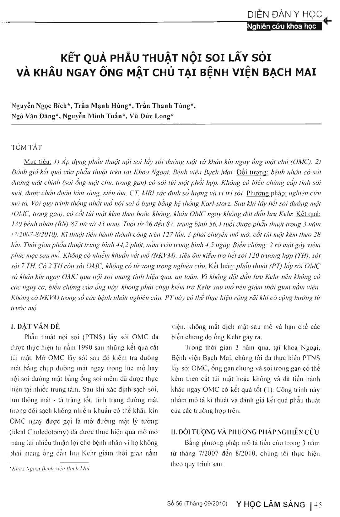 Kết quả phẫu thuật nội soi lấy sỏi và khâu ngay ống mật chủ tại bệnh viện Bạch Mai