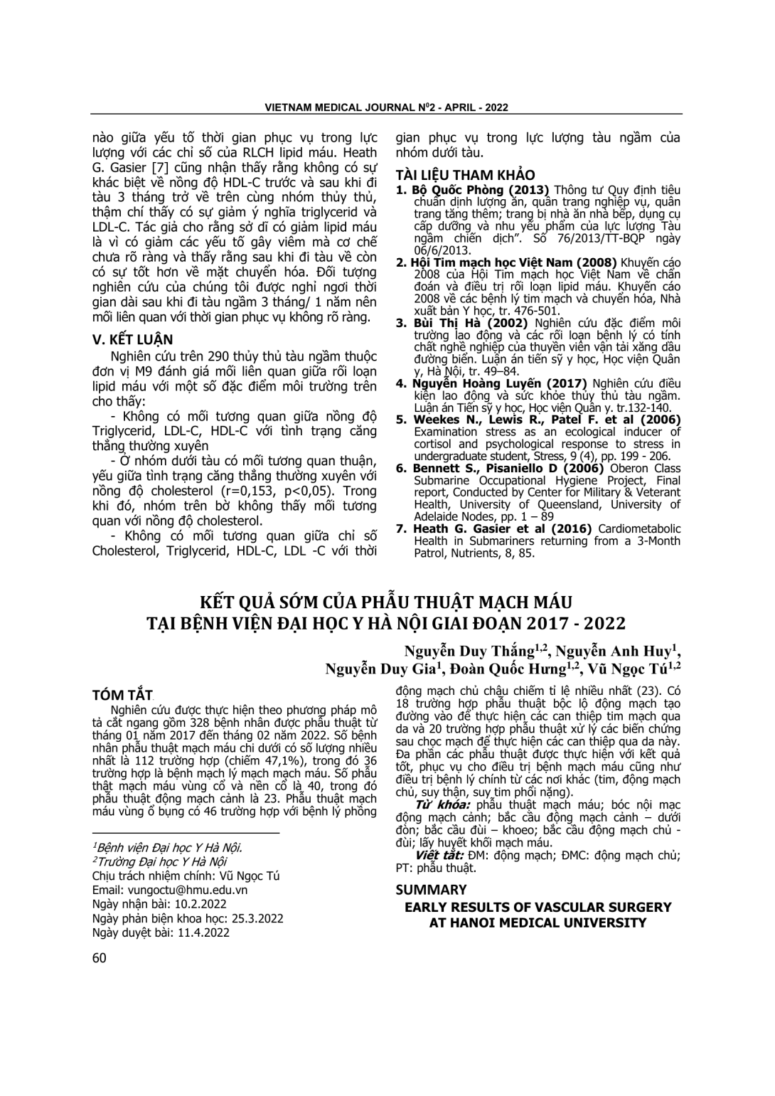 Nghiên cứu được thực hiện theo phương pháp mô tả cắt ngang gồm 328 bệnh nhân được phẫu thuật từ tháng 01 năm 2017 đến tháng 02 năm 2022. Số bệnh nhân phẫu thuật mạch máu chi dưới có số lượng nhiều nhất là 112 trường hợp (chiếm 47,1%), trong đó 36 trường hợp là bệnh mạch lý mạch mạch máu. Số phẫu thật mạch máu vùng cổ và nền cổ là 40, trong đó phẫu thuật động mạch cảnh là 23. Phẫu thuật mạch máu vùng ổ bụng có 46 trường hợp với bệnh lý phồng động mạch chủ chậu chiếm tỉ lệ nhiều nhất (23). Có 18 trường hợp phẫu thuật bộc lộ động mạch tạo đường vào để thực hiện các can thiệp tim mạch qua da và 20 trường hợp phẫu thuật xử lý các biến chứng sau chọc mạch để thực hiện các can thiệp qua da này. Đa phần các phẫu thuật được thực hiện với kết quả tốt, phục vụ cho điều trị bệnh mạch máu cũng như điều trị bệnh lý chính từ các nơi khác (tim, động mạch chủ, suy thận, suy tim phổi nặng).