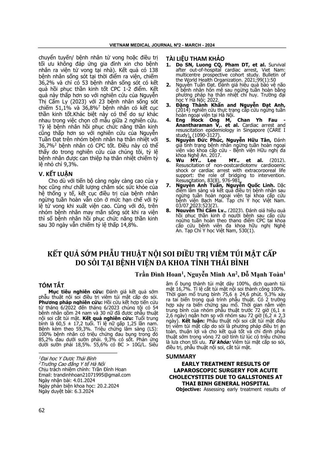 Đánh giá kết quả sớm phẫu thuật nội soi điều trị viêm túi mật cấp do sỏi. Phương pháp nghiên cứu: Hồi cứu kết hợp tiến cứu từ tháng 6/2022 đến tháng 6/2023 chúng tôi có 54 bệnh nhân gồm 24 nam và 30 nữ đã được phẫu thuật nội soi cắt túi mật. Kết quả nghiên cứu: Tuổi trung bình là 60,5 ± 17,2 tuổi. Tỉ lệ nữ gấp 1,25 lần nam. Bệnh kèm theo 59,3%. Triệu chứng lâm sàng (LS): 100% bệnh nhân có triệu chứng đau bụng trong đó 85,2% đau dưới sườn phải. 9,3% có sốt. Phản ứng dưới sườn phải 18,5%. 55,6% có BC > 10G/L. Siêu âm ổ bụng thành túi mật dày 100%, dịch quanh túi mật 16,7%. Tỉ lệ cắt túi mật nội soi thành công 100%. Thời gian mổ trung bình 75,6 ± 24,6 phút. 9,3% xảy ra tai biến trong quá trình phẫu thuật. Có 2 trường hợp xảy ra biến chứng sau mổ. Thời gian nằm viện trung bình của nhóm phẫu thuật trước 72 giờ (6,1 ± 2,6 ngày) ngắn hơn so với nhóm sau 72 giờ (6,2 ± 2,3 ngày). Kết luận: Phẫu thuật nội soi cắt túi mật điều trị viêm túi mật cấp do sỏi là phương pháp điều trị an toàn, thuận lợi và cho kết quả tốt và chỉ định phẫu thuật sớm trong vòng 72 giờ tính từ lúc có triệu chứng là lựa chọn tối ưu.