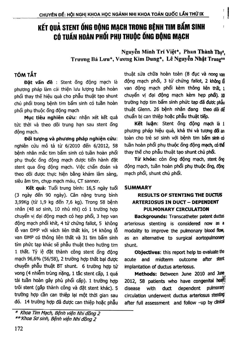 Backgrounds: Transcatheter patent ductus arteriosus stenting is considered now as a modality to improve the pulmonary blood flow, as an alternative to surgical aortopulmonary shunt. Objectives: this report help to evaluate the acute and midterm outcome after stent implantation of ductus arteriosus. Methods: Between June 2010 and June 2012, 58 patients who have congenital heart disease with duct dependent pulmonary circulation underwent ductus arteriosus stenting after full assessment and follow-up by clinical examination, echocardiogram, CT scanner and c angiogram. Results: Age of the patients was from 3 days to 90 days (mean: 16.5 days). Weight of them was from 1.9kgs to 7.6kgs (mean: 3.9 kgs). Patent ductus arteriosus stenting was successful in patients. In 58 patients, there are 1 with transposition of the great arteries and pulmonary stenosis, 4 of tetralogy of fallot, 3 of critical pulmonary stenosis, 5 of pulmonary atresia with intact VSD, 14 of pulmonary atresia with VSD and 31 cases of complex congenital heart diseases with univentricular morphology. Ductus stenting was successful in 56 cases (96.4 percent), 2 failure were then had BT shunts. 6 patients died after the procedure (1 acute thrombosis in stent, 1 pulmonary edema due to pulmonary overshuting, 4 cases of severe infection). In 1 patient, the stent was dislodged and migrated (but was successful to retrieve). Reintervention was necessary in 5 patients. 1 patient needed another aorto-pulmonary shunt. 14 cases had corrective operation or intervention (8 of pulmonary perforation and balloon valvuloplasty, 3 of tetralogy of fallot, 2 of pulmonary atresia with VSD, 1 of transposition of the great arteries with pulmonary stenosis). 10 patients had Glenn shunts. 26 patients are at follow up. Conclusion: Ductus arteriosus stent is feasible, safe and effective palliation in newborns and young infant with duct-dependent pulmonary circulation and can replace surgical aortopulmonary shunt especially in neonatal period.