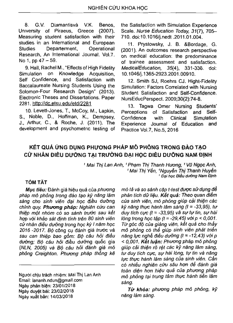 Mục tiêu: Đánh giá hiệu quả của phương pháp mô phỏng trong đào tạo kỹ năng lâm sàng cho sinh viên đại học điều dưỡng chính quy. Phương pháp: Nghiên cứu can thiệp một nhóm có so sánh trước sau kết hợp với khảo sát định tính trên 80 sinh viên cử nhân điều dưỡng trong học kỳ I năm học 2016 - 2017. Bộ công cụ đánh giá trước và sau can thiệp bao gồm: Bộ câu hỏi điều dưỡng; Bộ câu hỏi điều dưỡng quốc gia (NLN, 2005) và Bộ câu hỏi đánh giá mô phỏng Creighton. Phương pháp thống kê mô tả và so sánh cặp t-test được sử dụng để phân tích dữ liệu. Kết quả: Theo quan điểm của sinh viên, mô phỏng giúp cải thiện các kỹ năng thực hành lâm sàng (t = -33,95), tư duy tích cực (t = -33,95) và sự tự tin, sự hài lòng trong học tập (t = -29,45) với p 0,001. Từ góc độ của giảng viên, kết quả cho thấy mô phỏng có thể giúp sinh viên phát triển năng lực nghề điều dưỡng (t