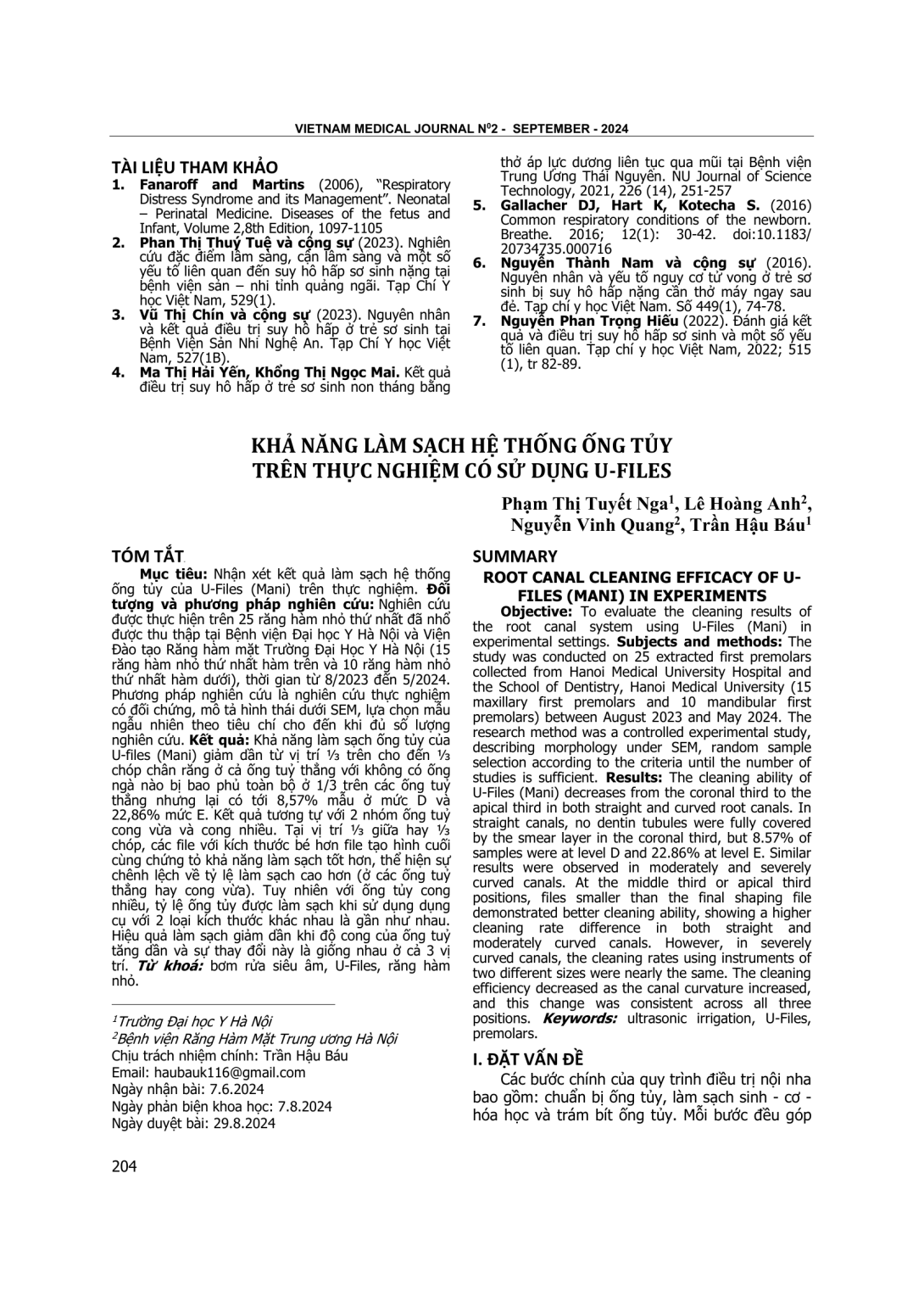 Nhận xét kết quả làm sạch hệ thống ống tủy của U-Files (Mani) trên thực nghiệm. Đối tượng và phương pháp nghiên cứu: Nghiên cứu được thực hiện trên 25 răng hàm nhỏ thứ nhất đã nhổ được thu thập tại Bệnh viện Đại học Y Hà Nội và Viện Đào tạo Răng hàm mặt Trường Đại Học Y Hà Nội (15 răng hàm nhỏ thứ nhất hàm trên và 10 răng hàm nhỏ thứ nhất hàm dưới), thời gian từ 8/2023 đến 5/2024. Phương pháp nghiên cứu là nghiên cứu thực nghiệm có đối chứng, mô tả hình thái dưới SEM, lựa chọn mẫu ngẫu nhiên theo tiêu chí cho đến khi đủ số lượng nghiên cứu. Kết quả: Khả năng làm sạch ống tủy của U-files (Mani) giảm dần từ vị trí ⅓ trên cho đến ⅓ chóp chân răng ở cả ống tuỷ thẳng với không có ống ngà nào bị bao phủ toàn bộ ở 1/3 trên các ống tuỷ thẳng nhưng lại có tới 8,57% mẫu ở mức D và 22,86% mức E. Kết quả tương tự với 2 nhóm ống tuỷ cong vừa và cong nhiều. Tại vị trí ⅓ giữa hay ⅓ chóp, các file với kích thước bé hơn file tạo hình cuối cùng chứng tỏ khả năng làm sạch tốt hơn, thể hiện sự chênh lệch về tỷ lệ làm sạch cao hơn (ở các ống tuỷ thẳng hay cong vừa). Tuy nhiên với ống tủy cong nhiều, tỷ lệ ống tủy được làm sạch khi sử dụng dụng cụ với 2 loại kích thước khác nhau là gần như nhau. Hiệu quả làm sạch giảm dần khi độ cong của ống tuỷ tăng dần và sự thay đổi này là giống nhau ở cả 3 vị trí.