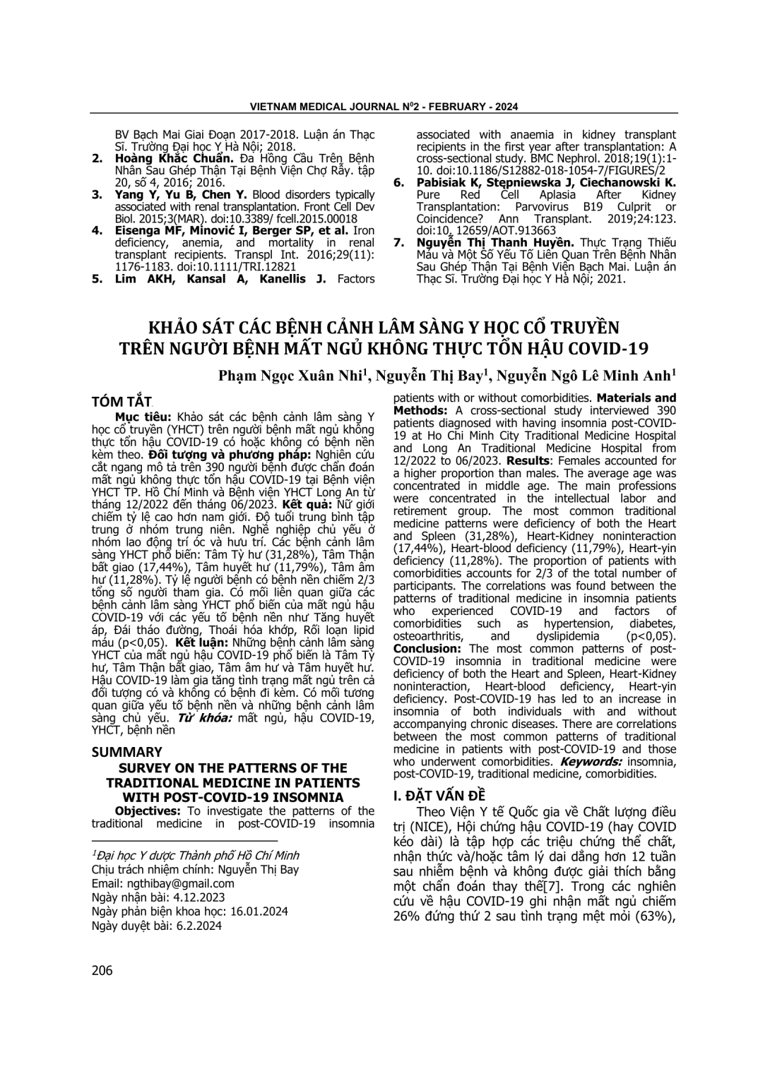 Khảo sát các bệnh cảnh lâm sàng Y học cổ truyền (YHCT) trên người bệnh mất ngủ không thực tổn hậu COVID-19 có hoặc không có bệnh nền kèm theo. Đối tượng và phương pháp: Nghiên cứu cắt ngang mô tả trên 390 người bệnh được chẩn đoán mất ngủ không thực tổn hậu COVID-19 tại Bệnh viện YHCT TP. Hồ Chí Minh và Bệnh viện YHCT Long An từ tháng 12/2022 đến tháng 06/2023. Kết quả: Nữ giới chiếm tỷ lệ cao hơn nam giới. Độ tuổi trung bình tập trung ở nhóm trung niên. Nghề nghiệp chủ yếu ở nhóm lao động trí óc và hưu trí. Các bệnh cảnh lâm sàng YHCT phổ biến: Tâm Tỳ hư (31,28%), Tâm Thận bất giao (17,44%), Tâm huyết hư (11,79%), Tâm âm hư (11,28%). Tỷ lệ người bệnh có bệnh nền chiếm 2/3 tổng số người tham gia. Có mối liên quan giữa các bệnh cảnh lâm sàng YHCT phổ biến của mất ngủ hậu COVID-19 với các yếu tố bệnh nền như Tăng huyết áp, Đái tháo đường, Thoái hóa khớp, Rối loạn lipid máu (p<0,05). Kết luận: Những bệnh cảnh lâm sàng YHCT của mất ngủ hậu COVID-19 phổ biến là Tâm Tỳ hư, Tâm Thận bất giao, Tâm âm hư và Tâm huyết hư. Hậu COVID-19 làm gia tăng tình trạng mất ngủ trên cả đối tượng có và không có bệnh đi kèm. Có mối tương quan giữa yếu tố bệnh nền và những bệnh cảnh lâm sàng chủ yếu.