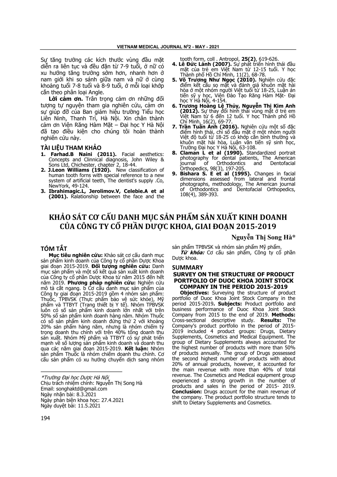 Khảo sát cơ cấu danh mục sản phẩm kinh doanh của Công ty cổ phần Dược Khoa giai đoạn 2015-2019. Đối tượng nghiên cứu: Danh mục sản phẩm và một số kết quả sản xuất kinh doanh của Công ty cổ phần Dược Khoa từ năm 2015 đến hết năm 2019. Phương pháp nghiên cứu: Nghiên cứu mô tả cắt ngang. b Cơ cấu danh mục sản phẩm của Công ty giai đoạn 2015-2019 gồm 4 nhóm sản phẩm: Thuốc, TPBVSK (Thực phẩm bảo vệ sức khỏe), Mỹ phẩm và TTBYT (Trang thiết bị Y tế). Nhóm TPBVSK luôn có số sản phẩm kinh doanh lớn nhất với trên 50% số sản phẩm kinh doanh hàng năm. Nhóm Thuốc có số sản phẩm kinh doanh đứng thứ 2 với khoảng 20% sản phẩm hàng năm, nhưng là nhóm chiếm tỷ trọng doanh thu chính với trên 40% tổng doanh thu sản xuất. Nhóm Mỹ phẩm và TTBYT có sự phát triển mạnh về số lượng sản phẩm kinh doanh và doanh thu qua các năm giai đoạn 2015-2019. Kết luận: Nhóm sản phẩm Thuốc là nhóm chiếm doanh thu chính. Cơ cấu sản phẩm có xu hướng chuyển dịch sang nhóm sản phẩm TPBVSK và nhóm sản phẩm Mỹ phẩm.