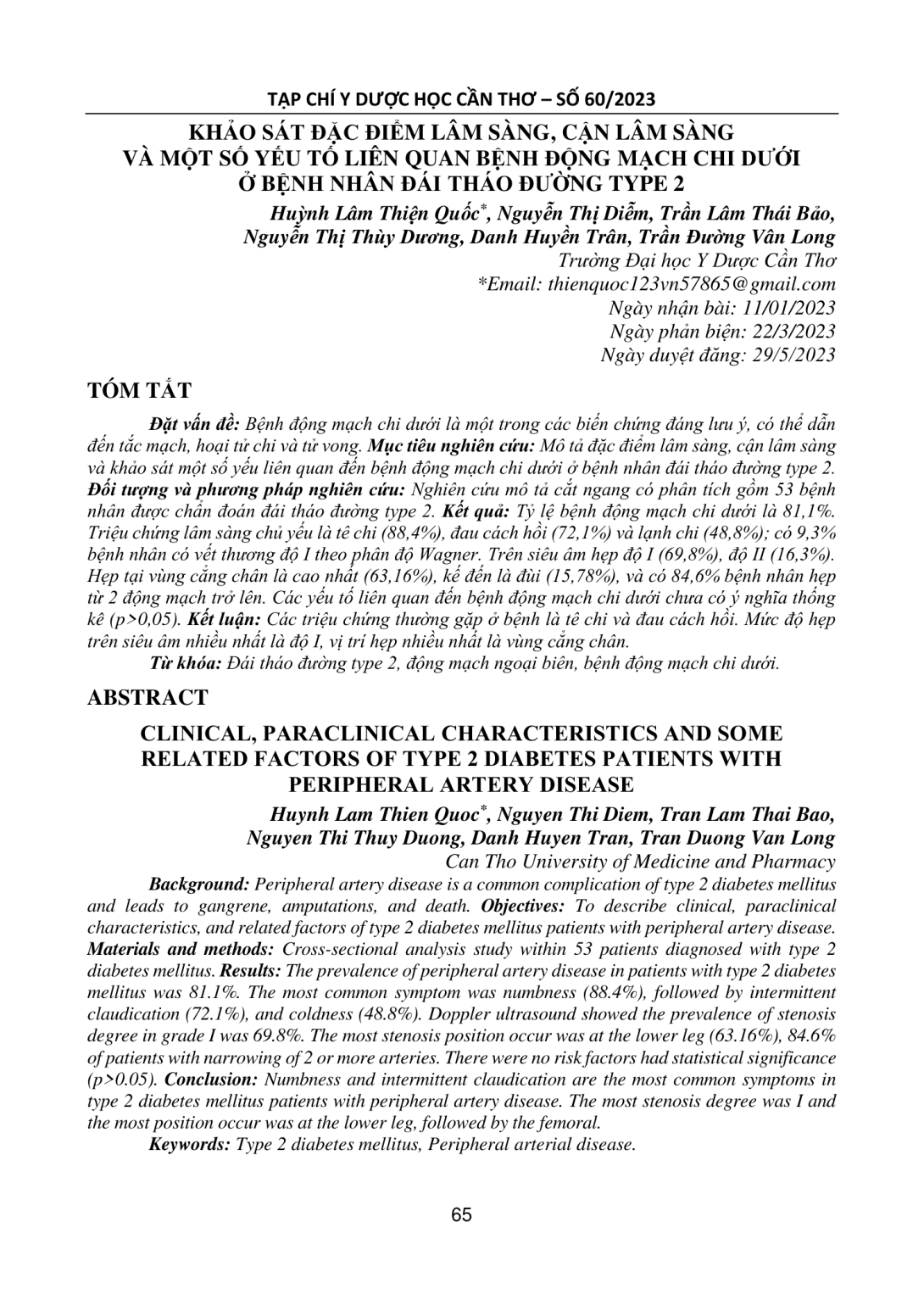 Mô tả đặc điểm lâm sàng, cận lâm sàng và khảo sát một số yếu liên quan đến bệnh động mạch chi dưới ở bệnh nhân đái tháo đường type 2. Đối tượng và phương pháp nghiên cứu: Nghiên cứu mô tả cắt ngang có phân tích gồm 53 bệnh nhân được chẩn đoán đái tháo đường type 2. Kết quả: Tỷ lệ bệnh động mạch chi dưới là 81,1%. Triệu chứng lâm sàng chủ yếu là tê chi (88,4%), đau cách hồi (72,1%) và lạnh chi (48,8%); có 9,3% bệnh nhân có vết thương độ I theo phân độ Wagner. Trên siêu âm hẹp độ I (69,8%), độ II (16,3%). Hẹp tại vùng cẳng chân là cao nhất (63,16%), kế đến là đùi (15,78%), và có 84,6% bệnh nhân hẹp từ 2 động mạch trở lên. Các yếu tố liên quan đến bệnh động mạch chi dưới chưa có ý nghĩa thống kê (p>0,05). Kết luận: Các triệu chứng thường gặp ở bệnh là tê chi và đau cách hồi. Mức độ hẹp trên siêu âm nhiều nhất là độ I, vị trí hẹp nhiều nhất là vùng cẳng chân.