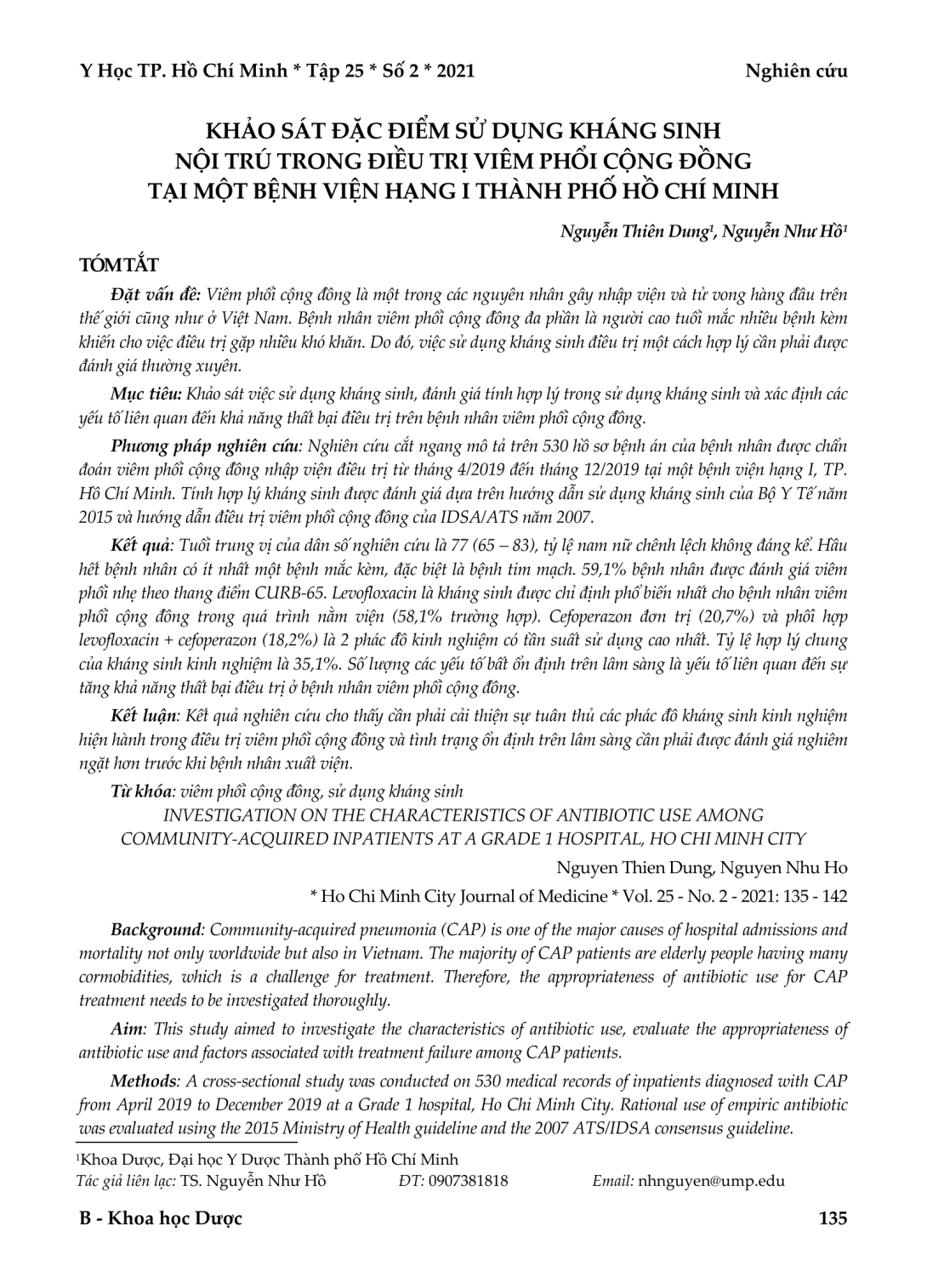 Viêm phổi cộng đồng là một trong các nguyên nhân gây nhập viện và tử vong hàng đầu trên thế giới cũng như ở Việt Nam. Bệnh nhân viêm phổi cộng đồng đa phần là người cao tuổi mắc nhiều bệnh kèm khiến cho việc điều trị gặp nhiều khó khăn. Do đó, việc sử dụng kháng sinh điều trị một cách hợp lý cần phải được đánh giá thường xuyên. Mục tiêu: Khảo sát việc sử dụng kháng sinh, đánh giá tính hợp lý trong sử dụng kháng sinh và xác định các yếu tố liên quan đến khả năng thất bại điều trị trên bệnh nhân viêm phổi cộng đồng. Phương pháp nghiên cứu: Nghiên cứu cắt ngang mô tả trên 530 hồ sơ bệnh án của bệnh nhân được chẩn đoán viêm phổi cộng đồng nhập viện điều trị từ tháng 4/2019 đến tháng 12/2019 tại một bệnh viện hạng I, TP. Hồ Chí Minh. Tính hợp lý kháng sinh được đánh giá dựa trên hướng dẫn sử dụng kháng sinh của Bộ Y Tế năm 2015 và hướng dẫn điều trị viêm phổi cộng đồng của IDSA/ATS năm 2007. Kết quả: Tuổi trung vị của dân số nghiên cứu là 77 (65 – 83), tỷ lệ nam nữ chênh lệch không đáng kể. Hầu hết bệnh nhân có ít nhất một bệnh mắc kèm, đặc biệt là bệnh tim mạch. 59,1% bệnh nhân được đánh giá viêm phổi nhẹ theo thang điểm CURB-65. Levofloxacin là kháng sinh được chỉ định phổ biến nhất cho bệnh nhân viêm phổi cộng đồng trong quá trình nằm viện (58,1% trường hợp). Cefoperazon đơn trị (20,7%) và phối hợp levofloxacin + cefoperazon (18,2%) là 2 phác đồ kinh nghiệm có tần suất sử dụng cao nhất. Tỷ lệ hợp lý chung của kháng sinh kinh nghiệm là 35,1%. Số lượng các yếu tố bất ổn định trên lâm sàng là yếu tố liên quan đến sự tăng khả năng thất bại điều trị ở bệnh nhân viêm phổi cộng đồng. Kết luận: Kết quả nghiên cứu cho thấy cần phải cải thiện sự tuân thủ các phác đồ kháng sinh kinh nghiệm hiện hành trong điều trị viêm phổi cộng đồng và tình trạng ổn định trên lâm sàng cần phải được đánh giá nghiêm ngặt hơn trước khi bệnh nhân xuất viện.
