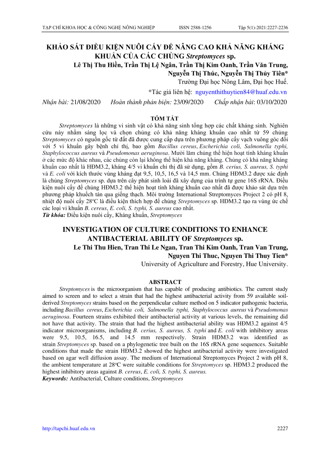 Streptomyces là những vi sinh vật có khả năng sinh tổng hợp các chất kháng sinh. Nghiên cứu này nhằm sàng lọc và chọn chủng có khả năng kháng khuẩn cao nhất từ 59 chủng Streptomyces có nguồn gốc từ đất đã được cung cấp dựa trên phương pháp cấy vạch vuông góc đối với 5 vi khuẩn gây bệnh chỉ thị, bao gồm Bacillus cereus, Escherichia coli, Salmonella typhi, Staphylococcus aureus và Pseudomonas aeruginosa. Mười lăm chủng thể hiện hoạt tính kháng khuẩn ở các mức độ khác nhau, các chủng còn lại không thể hiện khả năng kháng. Chủng có khả năng kháng khuẩn cao nhất là HĐM3.2, kháng 4/5 vi khuẩn chỉ thị đã sử dụng, gồm B. cerius, S. aureus, S. typhi và E. coli với kích thước vùng kháng đạt 9,5, 10,5, 16,5 và 14,5 mm. Chủng HĐM3.2 được xác định là chủng Streptomyces sp. dựa trên cây phát sinh loài đã xây dựng của trình tự gene 16S rRNA. Điều kiện nuôi cấy để chủng HĐM3.2 thể hiện hoạt tính kháng khuẩn cao nhất đã được khảo sát dựa trên phương pháp khuếch tán qua giếng thạch. Môi trường International Streptomyces Project 2 có pH 8, nhiệt độ nuôi cấy 28oC là điều kiện thích hợp để chủng Streptomyces sp. HĐM3.2 tạo ra vùng ức chế các loại vi khuẩn B. cereus, E. coli, S. typhi, S. aureus cao nhất.