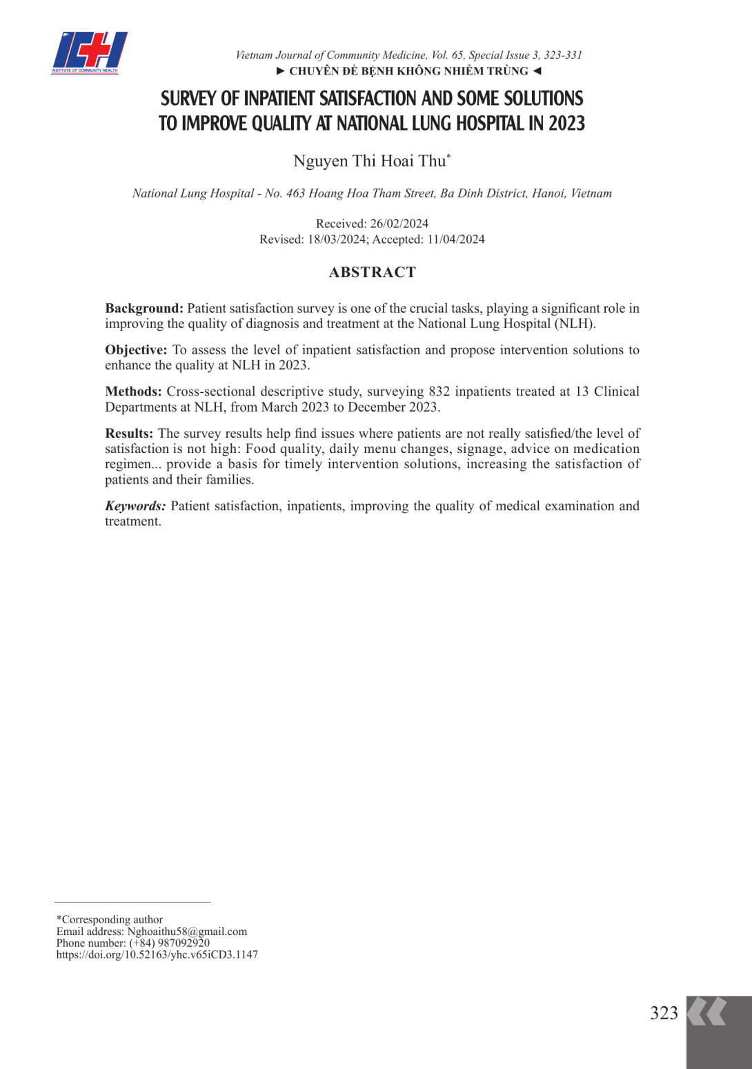 Patient satisfaction survey is one of the crucial tasks, playing a significant role in improving the quality of diagnosis and treatment at the National Lung Hospital (NLH). Objective: To assess the level of inpatient satisfaction and propose intervention solutions to enhance the quality at NLH in 2023. Methods: Cross-sectional descriptive study, surveying 832 inpatients treated at 13 Clinical Departments at NLH, from March 2023 to December 2023. Results: The survey results help find issues where patients are not really satisfied/the level of satisfaction is not high: Food quality, daily menu changes, signage, advice on medication regimen... provide a basis for timely intervention solutions, increasing the satisfaction of patients and their families.