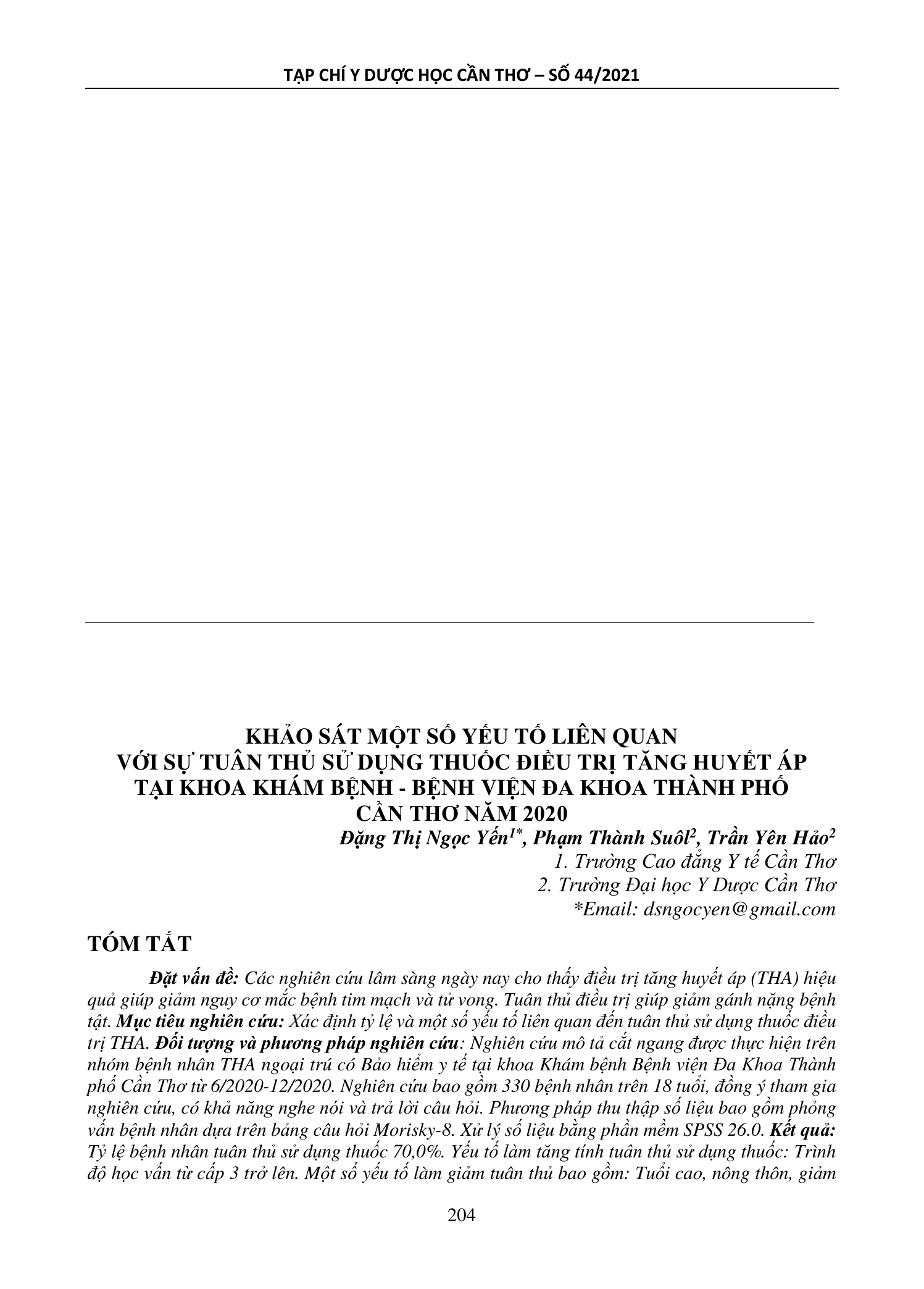 Các nghiên cứu lâm sàng ngày nay cho thấy điều trị tăng huyết áp (THA) hiệu quả giúp giảm nguy cơ mắc bệnh tim mạch và tử vong. Tuân thủ điều trị giúp giảm gánh nặng bệnh tật. Mục tiêu nghiên cứu: Xác định tỷ lệ và một số yếu tố liên quan đến tuân thủ sử dụng thuốc điều trị THA. Đối tượng và phương pháp nghiên cứu: Nghiên cứu mô tả cắt ngang được thực hiện trên nhóm bệnh nhân THA ngoại trú có Bảo hiểm y tế tại khoa Khám bệnh Bệnh viện Đa Khoa Thành phố Cần Thơ từ 6/2020-12/2020. Nghiên cứu bao gồm 330 bệnh nhân trên 18 tuổi, đồng ý tham gia nghiên cứu, có khả năng nghe nói và trả lời câu hỏi. Phương pháp thu thập số liệu bao gồm phỏng vấn bệnh nhân dựa trên bảng câu hỏi Morisky-8. Xử lý số liệu bằng phần mềm SPSS 26.0. Kết quả: Tỷ lệ bệnh nhân tuân thủ sử dụng thuốc 70,0%. Yếu tố làm tăng tính tuân thủ sử dụng thuốc: Trình độ học vấn từ cấp 3 trở lên. Một số yếu tố làm giảm tuân thủ bao gồm: Tuổi cao, nông thôn, giảm lao động, thời gian mắc bệnh kéo dài, thời gian điều trị kéo dài. Kết luận: Tỷ lệ tuân thủ sử dụng thuốc điều trị THA 70%. Việc xác định các yếu tố giảm tuân thủ gợi ý các nghiên cứu sâu hơn về chăm sóc dược cho bệnh nhân THA.