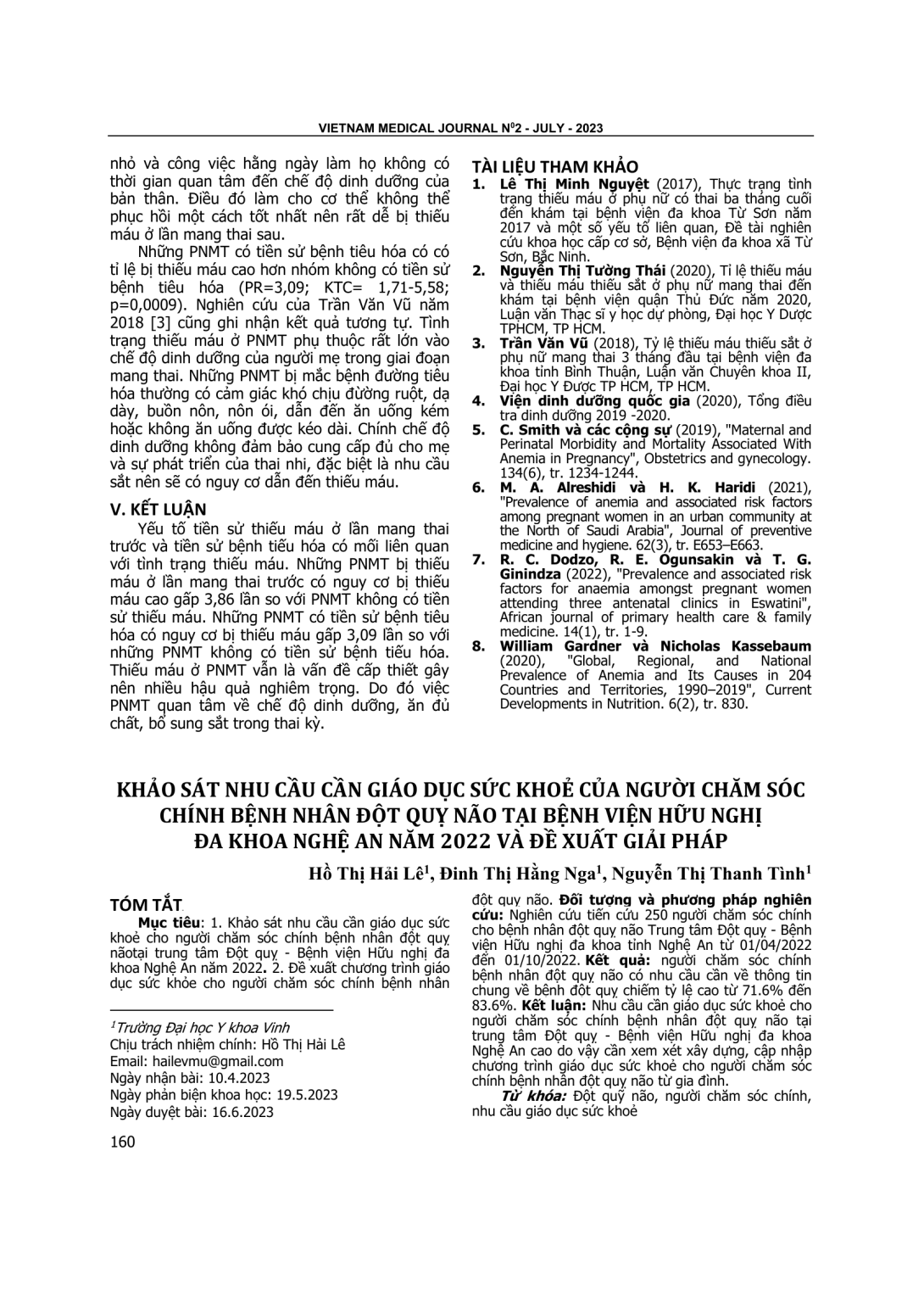 Khảo sát nhu cầu cần giáo dục sức khoẻ cho người chăm sóc chính bệnh nhân đột quỵ nãotại trung tâm Đột quỵ - Bệnh viện Hữu nghị đa khoa Nghệ An năm 2022. 2. Đề xuất chương trình giáo dục sức khỏe cho người chăm sóc chính bệnh nhân đột quỵ não. Đối tượng và phương pháp nghiên cứu: Nghiên cứu tiến cứu 250 người chăm sóc chính cho bệnh nhân đột quỵ não Trung tâm Đột quỵ - Bệnh viện Hữu nghị đa khoa tỉnh Nghệ An từ 01/04/2022 đến 01/10/2022. Kết quả: người chăm sóc chính bệnh nhân đột quỵ não có nhu cầu cần về thông tin chung về bệnh đột quỵ chiếm tỷ lệ cao từ 71.6% đến 83.6%. Kết luận: Nhu cầu cần giáo dục sức khoẻ cho người chăm sóc chính bệnh nhân đột quỵ não tại trung tâm Đột quỵ - Bệnh viện Hữu nghị đa khoa Nghệ An cao do vậy cần xem xét xây dựng, cập nhập chương trình giáo dục sức khoẻ cho người chăm sóc chính bệnh nhân đột quỵ não từ gia đình.