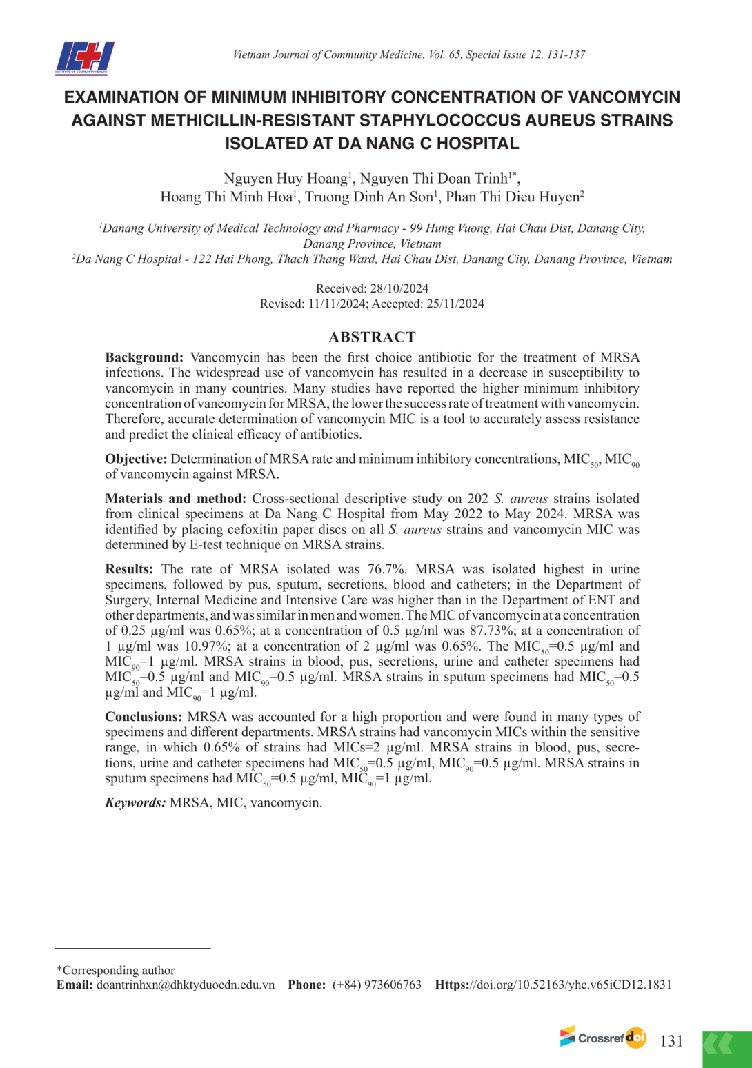 Vancomycin là kháng sinh được lựa chọn đầu tiên để điều trị các trường hợp nhiễm MRSA. Việc sử dụng rộng rãi kháng sinh này gây ra sự giảm nhạy cảm với vancomycin ở nhiều quốc gia. Nhiều nghiên cứu cho thấy, nồng độ ức chế tối thiểu của vancomycin đối với MRSA càng cao thì tỷ lệ điều trị thành công với vancomycin càng thấp. Do vậy, việc xác định chính xác MIC của vancomycin là công cụ đánh giá chính xác sự đề kháng và tiên lượng hiệu quả của kháng sinh trên lâm sàng. Mục tiêu: Xác định tỷ lệ MRSA và nồng độ ức chế tối thiểu, MIC50, MIC90 của vancomycin đối với MRSA. Đối tượng và phương pháp: Nghiên cứu mô tả cắt ngang trên 202 chủng S. aureus phân lập được từ bệnh phẩm tại Bệnh viện C Đà Nẵng từ 5/2022-5/2024. Xác định MRSA bằng khoanh giấy cefoxitin đối với tất cả chủng S. aureus và xác định MIC vancomycin bằng kỹ thuật E-test trên MRSA. Kết quả: Tỷ lệ MRSA phân lập được là 76,7%. MRSA phân lập cao nhất ở bệnh phẩm nước tiểu, tiếp theo là mủ, đàm, dịch tiết, máu và chân catheter; ở khoa Ngoại, Nội và Hồi sức tích cực cao hơn khoa Tai Mũi Họng và các khoa khác; ở nam và nữ tương đương nhau. MIC vancomycin ở nồng độ 0,25 µg/ml chiếm 0,65%; ở nồng độ 0,5 µg/ml chiếm 87,73%; ở nồng độ 1 µg/ml chiếm 10,97%; ở nồng độ 2 µg/ml chiếm 0,65%. Giá trị MIC50 = 0,5 µg/ml và MIC90 = 1 µg/ml. Các chủng MRSA ở bệnh phẩm máu, mủ, dịch tiết, nước tiểu và chân catheter có MIC50 = 0,5 µg/ml và MIC90 = 0,5 µg/ml. Các chủng MRSA ở bệnh phẩm đàm có MIC50 = 0,5 µg/ml và MIC90 = 1 µg/ml. Kết luận: MRSA được phân lập chiếm tỷ lệ cao và gặp ở nhiều loại bệnh phẩm, các khoa phòng khác nhau. Các chủng MRSA có MIC vancomycin nằm trong giới hạn nhạy cảm, 0,65% chủng có MIC = 2 µg/ml. MRSA ở bệnh phẩm máu, mủ, dịch tiết, nước tiểu và chân catheter có MIC50 = 0,5 µg/ml, MIC90 = 0,5 µg/ml. MRSA ở bệnh phẩm đàm có MIC50 = 0,5 µg/ml, MIC90 = 1 µg/ml.