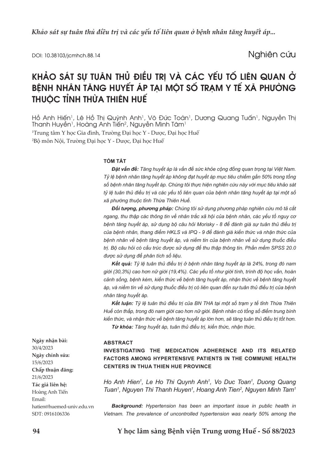Hypertension has been an important issue in public health in Vietnam. The prevalence of uncontrolled hypertension was nearly 50% among the hypertensive population in Vietnam. The objective of this study was to investigate the prevalence of medication adherence and its associated factors among patients with hypertension in the commune health centers in Thua Thien Hue Province. Methods: The study was a cross - sectional survey in which sociodemographic characteristics, hypertension risk factors, the eight - item Morisky Medication Adherence Scale (MMAS - 8), the hypertension knowledge - level scale (HK - LS), the brief Illness Perception of hypertension, and the beliefs about hypertension medication were measured and explored in terms of their relationship with medication adherence. A structured questionnaire was used as a data collection tool. The data were then analyzed with the help of SPSS version 20.0. Results: A total of 279 patients participated in the survey; 24,0% (30,3% in men and 19,4% in women) were adherent to their hypertension medication. The factors significantly associated with better medication adherence were gender, educational status, family background, comorbidity, knowledge about hypertension, illness perception of hypertension, and beliefs about hypertension medication. Conclusion: The rate of treatment adherence of hypertensive patients at some health stations in Thua Thien Hue province is still low, of which men are higher than women. Patients with a greater mean score of knowledge, and awareness of hypertension, will have better adherence to treatment.