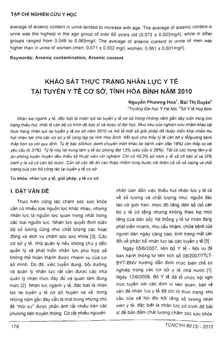 Human resources, special at grassroot level are shortage during many years, particular physicians and pharmacists. The study was to survey of human resources in basic health levels in 2010 and to describe some solutions which were implemented for improving human resources in Hoa Binh province. The results indicated that the proportion of health staff/bed was lower than requirement. The proportion of physician/other (19 percent) was lower than requirement ( or = 31 percent). This proportion at preventive centre was 13 percent (requirement or = 26 percent). All preventive centers had lack of examination technician. Only 45.3 percent of communal health centers had physician and 32 percent of them had any kind of pharmacist. In conclusions, some intervention projects should be implemented as soon as possible for improving both quantity and quality of health staff who work at grassroot level.