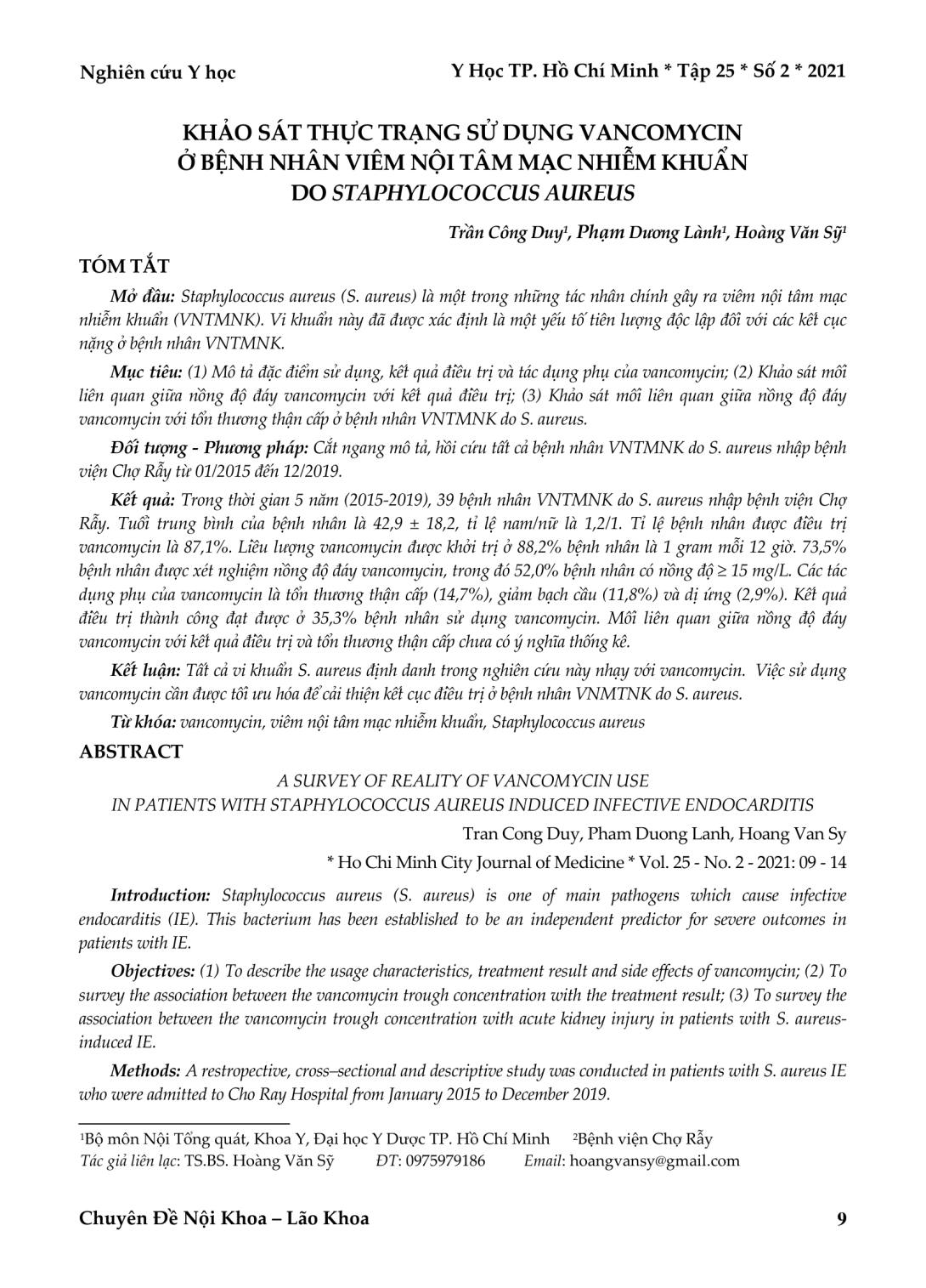 Mô tả đặc điểm sử dụng, kết quả điều trị và tác dụng phụ của vancomycin. Khảo sát mối liên quan giữa nồng độ đáy vancomycin với kết quả điều trị. Khảo sát mối liên quan giữa nồng độ đáy vancomycin với tổn thương thận cấp ở bệnh nhân VNTMNK do S. aureus. Đối tượng - Phương pháp: Cắt ngang mô tả, hồi cứu tất cả bệnh nhân VNTMNK do S. aureus nhập bệnh viện Chợ Rẫy từ 01/2015 đến 12/2019. Kết quả: Trong thời gian 5 năm (2015-2019), 39 bệnh nhân VNTMNK do S. aureus nhập bệnh viện Chợ Rẫy. Tuổi trung bình của bệnh nhân là 42,9 ± 18,2, tỉ lệ nam/nữ là 1,2/1. Tỉ lệ bệnh nhân được điều trị vancomycin là 87,1%. Liều lượng vancomycin được khởi trị ở 88,2% bệnh nhân là 1 gram mỗi 12 giờ. 73,5% bệnh nhân được xét nghiệm nồng độ đáy vancomycin, trong đó 52,0% bệnh nhân có nồng độ ≥ 15 mg/L. Các tác dụng phụ của vancomycin là tổn thương thận cấp (14,7%), giảm bạch cầu (11,8%) và dị ứng (2,9%). Kết quả điều trị thành công đạt được ở 35,3% bệnh nhân sử dụng vancomycin. Mối liên quan giữa nồng độ đáy vancomycin với kết quả điều trị và tổn thương thận cấp chưa có ý nghĩa thống kê. Kết luận: Tất cả vi khuẩn S. aureus định danh trong nghiên cứu này nhạy với vancomycin. Việc sử dụng vancomycin cần được tối ưu hóa để cải thiện kết cục điều trị ở bệnh nhân VNMTNK do S. aureus.