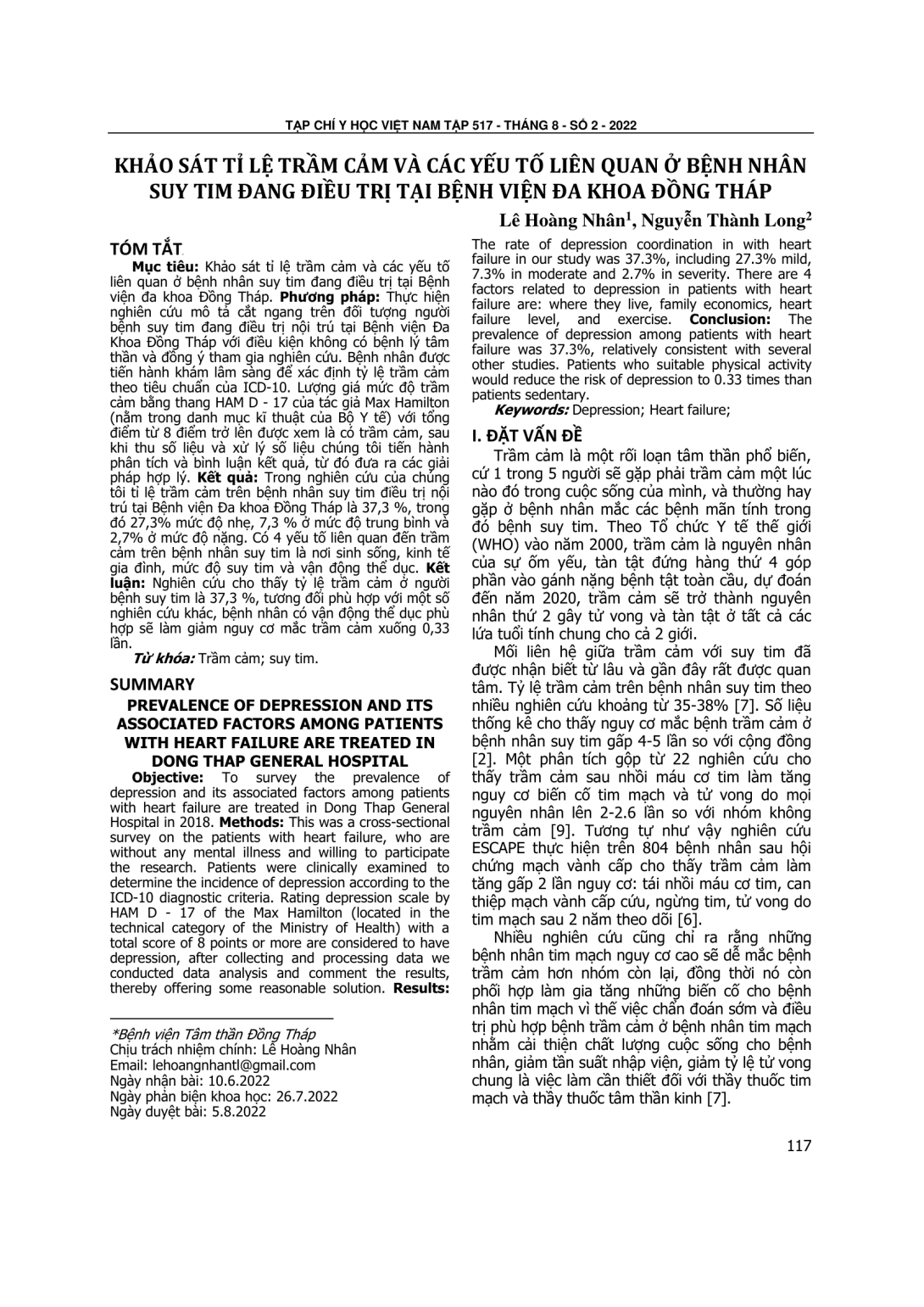 Khảo sát tỉ lệ trầm cảm và các yếu tố liên quan ở bệnh nhân suy tim đang điều trị tại Bệnh viện đa khoa Đồng Tháp. Phương pháp: Thực hiện nghiên cứu mô tả cắt ngang trên đối tượng người bệnh suy tim đang điều trị nội trú tại Bệnh viện Đa Khoa Đồng Tháp với điều kiện không có bệnh lý tâm thần và đồng ý tham gia nghiên cứu. Bệnh nhân được tiến hành khám lâm sàng để xác định tỷ lệ trầm cảm theo tiêu chuẩn của ICD-10. Lượng giá mức độ trầm cảm bằng thang HAM D - 17 của tác giả Max Hamilton (nằm trong danh mục kĩ thuật của Bộ Y tế) với tổng điểm từ 8 điểm trở lên được xem là có trầm cảm, sau khi thu số liệu và xử lý số liệu chúng tôi tiến hành phân tích và bình luận kết quả, từ đó đưa ra các giải pháp hợp lý. Kết quả: Trong nghiên cứu của chúng tôi tỉ lệ trầm cảm trên bệnh nhân suy tim điều trị nội trú tại Bệnh viện Đa khoa Đồng Tháp là 37,3 %, trong đó 27,3% mức độ nhẹ, 7,3 % ở mức độ trung bình và 2,7% ở mức độ nặng. Có 4 yếu tố liên quan đến trầm cảm trên bệnh nhân suy tim là nơi sinh sống, kinh tế gia đình, mức độ suy tim và vận động thể dục. Kết luận: Nghiên cứu cho thấy tỷ lệ trầm cảm ở người bệnh suy tim là 37,3 %, tương đối phù hợp với một số nghiên cứu khác, bệnh nhân có vận động thể dục phù hợp sẽ làm giảm nguy cơ mắc trầm cảm xuống 0,33 lần.