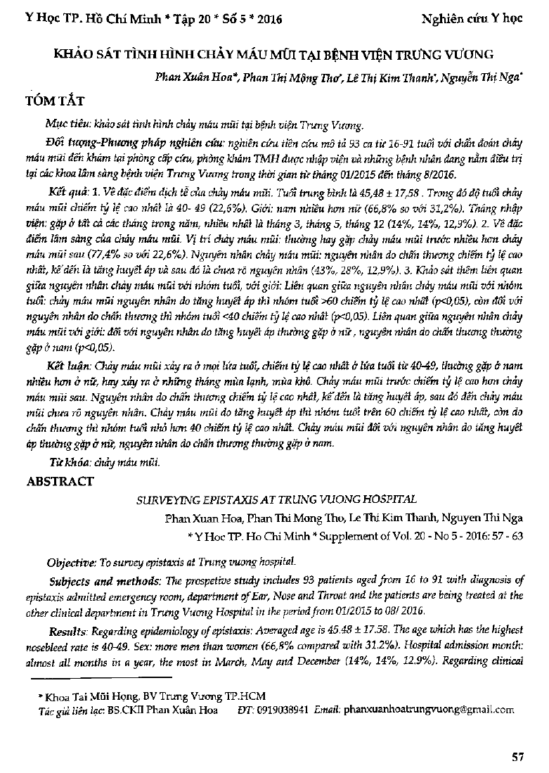 Khảo sát tình hình chảy máu mũi tại Bệnh viện Trưng Vương