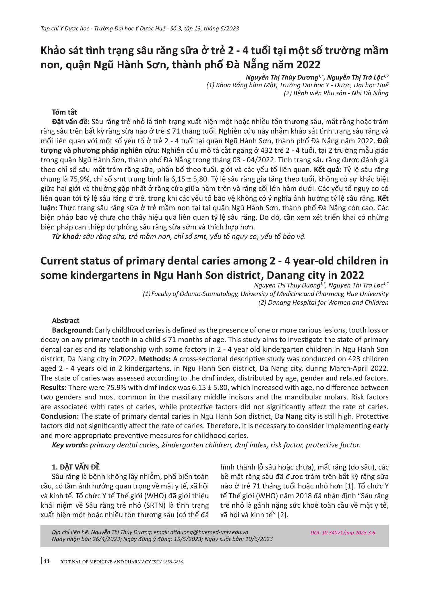 Sâu răng trẻ nhỏ là tình trạng xuất hiện một hoặc nhiều tổn thương sâu, mất răng hoặc trám răng sâu trên bất kỳ răng sữa nào ở trẻ ≤ 71 tháng tuổi. Nghiên cứu này nhằm khảo sát tình trạng sâu răng và mối liên quan với một số yếu tố ở trẻ 2 - 4 tuổi tại quận Ngũ Hành Sơn, thành phố Đà Nẵng năm 2022. Đối tượng và phương pháp nghiên cứu: Nghiên cứu mô tả cắt ngang ở 432 trẻ 2 - 4 tuổi, tại 2 trường mẫu giáo trong quận Ngũ Hành Sơn, thành phố Đà Nẵng trong tháng 03 - 04/2022. Tình trạng sâu răng được đánh giá theo chỉ số sâu mất trám răng sữa, phân bố theo tuổi, giới và các yếu tố liên quan. Kết quả: Tỷ lệ sâu răng chung là 75,9%, chỉ số smt trung bình là 6,15 ± 5,80. Tỷ lệ sâu răng gia tăng theo tuổi, không có sự khác biệt giữa hai giới và thường gặp nhất ở răng cửa giữa hàm trên và răng cối lớn hàm dưới. Các yếu tố nguy cơ có liên quan tới tỷ lệ sâu răng ở trẻ, trong khi các yếu tố bảo vệ không có ý nghĩa ảnh hưởng tỷ lệ sâu răng. Kết luận: Thực trạng sâu răng sữa ở trẻ mầm non tại tại quận Ngũ Hành Sơn, thành phố Đà Nẵng còn cao. Các biện pháp bảo vệ chưa cho thấy hiệu quả liên quan tỷ lệ sâu răng. Do đó, cần xem xét triển khai có những biện pháp can thiệp dự phòng sâu răng sữa sớm và thích hợp hơn.