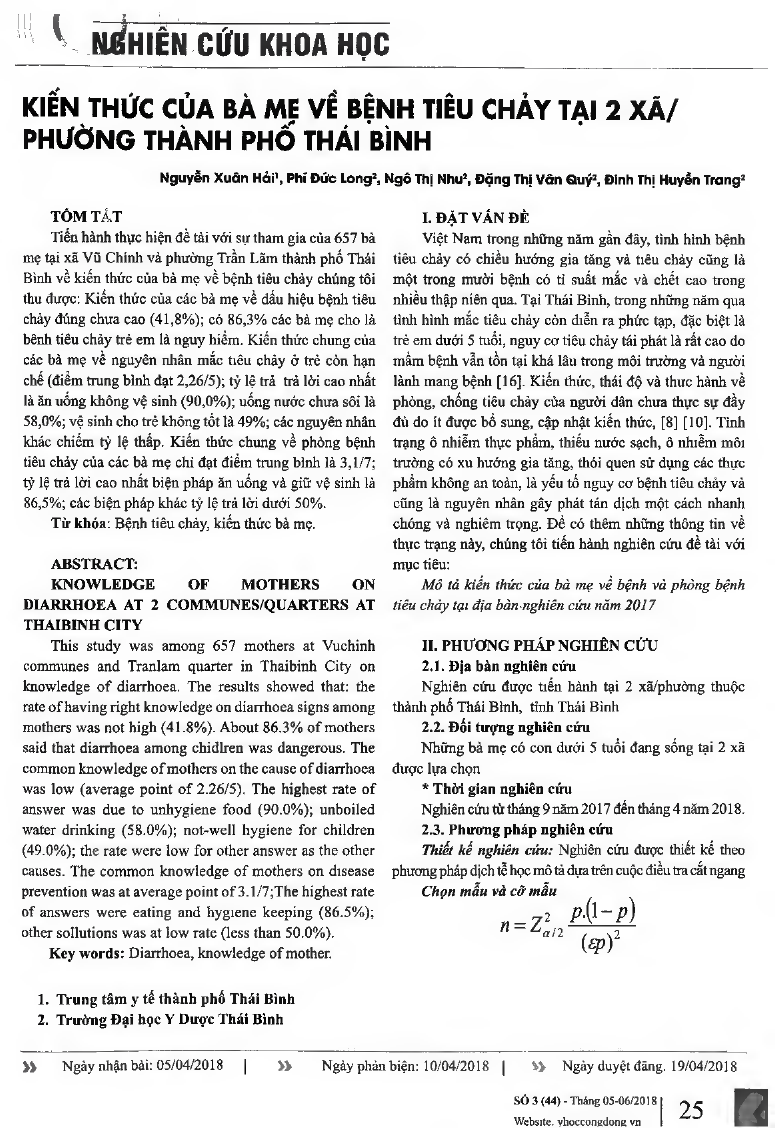 Đề tài thực hiện với sự tham gia của 657 bà mẹ tại xã Vũ Chính và phường Trần Lãm, thành phố Thái Bình về kiến thức của bà mẹ về bệnh tiêu chảy chúng tôi thu được: Kiến thức của các bà mẹ về dấu hiệu bệnh tiêu chảy đúng chưa cao (41,8 Nhằm mục đích nâng cao khả năng quản lý chăm sóc sức khỏe của người cao tuổi ở tại một số xã vùng nông thôn, tỉnh Thái Bình. Thiết kế nghiên cứu mô tả cắt ngang có kết hợp phân tích, được tiến hành trên 365 người cao tuổi tại 5 xã vùng nông thôn, tỉnh Thái Bình thông qua phỏng vấn trực tiếp đối tượng. Kết quả cho thấy, tỷ lệ người cao tuổi có thực hành chăm sóc sức khỏe chưa tốt là 65,8 phần trăm. Trong đó, tỷ lệ người cao tuổi có hút thuốc lá 30,2 phần trăm, có uống rượu bia 63,3 phần trăm, không tập thể dục 68,4 phần trăm, thường xuyên ăn mặn 75,0 phần trăm và không ăn hoa quả hàng ngày là 65,0 phần trăm. Người cao tuổi góa vợ hoặc chồng, già yếu, có bệnh tật có xu hướng thực hành chăm sóc sức khỏe chưa tốt (OR1 và CI 95 phần trăm từ 1,13-4,54, p0,05).); có 86,3 Nhằm mục đích nâng cao khả năng quản lý chăm sóc sức khỏe của người cao tuổi ở tại một số xã vùng nông thôn, tỉnh Thái Bình. Thiết kế nghiên cứu mô tả cắt ngang có kết hợp phân tích, được tiến hành trên 365 người cao tuổi tại 5 xã vùng nông thôn, tỉnh Thái Bình thông qua phỏng vấn trực tiếp đối tượng. Kết quả cho thấy, tỷ lệ người cao tuổi có thực hành chăm sóc sức khỏe chưa tốt là 65,8 phần trăm. Trong đó, tỷ lệ người cao tuổi có hút thuốc lá 30,2 phần trăm, có uống rượu bia 63,3 phần trăm, không tập thể dục 68,4 phần trăm, thường xuyên ăn mặn 75,0 phần trăm và không ăn hoa quả hàng ngày là 65,0 phần trăm. Người cao tuổi góa vợ hoặc chồng, già yếu, có bệnh tật có xu hướng thực hành chăm sóc sức khỏe chưa tốt (OR1 và CI 95 phần trăm từ 1,13-4,54, p0,05). các bà mẹ cho là bệnh tiêu chảy trẻ em là nguy hiểm. Kiến thức chung của các bà mẹ về nguyên nhâm mắc tiêu chảy ở trẻ còn hạn chế (điểm trung bình đạt 2,26/5); tỷ lệ trả lời cao nhất là ăn uống không vệ sinh (90,0); uống nước chưa sôi là 58,0; vệ sinh cho trẻ không tốt là 49 phần trăm; các nguyên nhân khác chiếm tỷ lệ thấp. Kiến thức chung về phòng bệnh tiêu chảy của các bà mẹ chỉ đạt điểm trung bình là 3,1/7; tỷ lệ trả lời cao nhất biện pháp ăn uống và giữ vệ sinh là 86,5 phần trăm, các biện pháp khác tỷ lệ trả lời dưới 50 phần trăm.