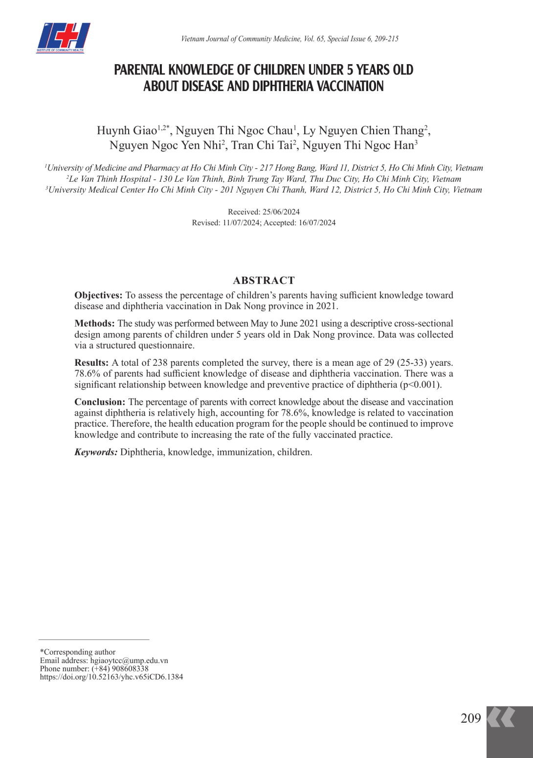 To assess the percentage of children’s parents having sufficient knowledge toward disease and diphtheria vaccination in Dak Nong province in 2021. Methods: The study was performed between May to June 2021 using a descriptive cross-sectional design among parents of children under 5 years old in Dak Nong province. Data was collected via a structured questionnaire. Results: A total of 238 parents completed the survey, there is a mean age of 29 (25-33) years. 78.6% of parents had sufficient knowledge of disease and diphtheria vaccination. There was a significant relationship between knowledge and preventive practice of diphtheria (p<0.001). Conclusion: The percentage of parents with correct knowledge about the disease and vaccination against diphtheria is relatively high, accounting for 78.6%, knowledge is related to vaccination practice. Therefore, the health education program for the people should be continued to improve knowledge and contribute to increasing the rate of the fully vaccinated practice.