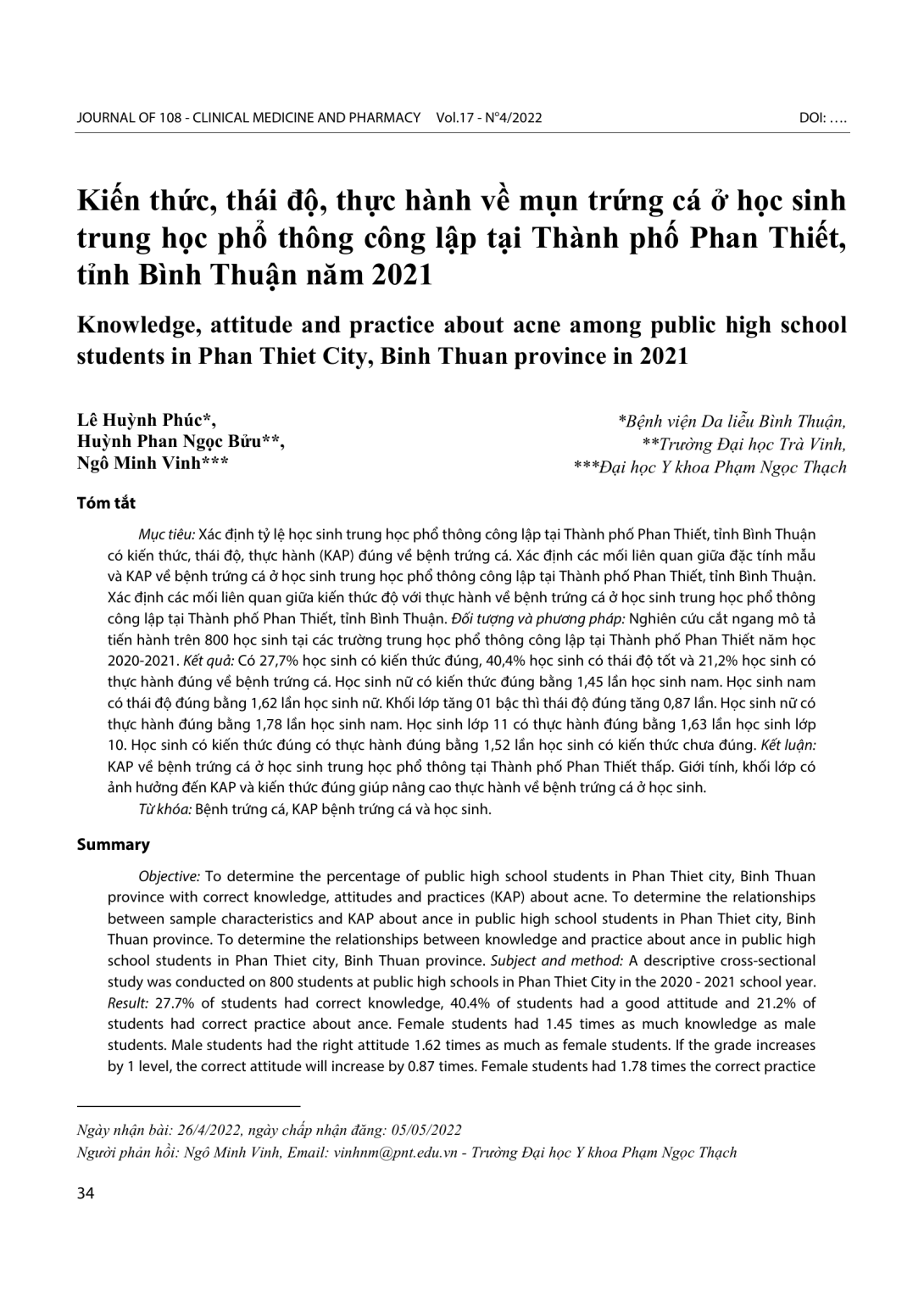 Xác định tỷ lệ học sinh trung học phổ thông công lập tại Thành phố Phan Thiết, tỉnh Bình Thuận có kiến thức, thái độ, thực hành (KAP) đúng về bệnh trứng cá. Xác định các mối liên quan giữa đặc tính mẫu và KAP về bệnh trứng cá ở học sinh trung học phổ thông công lập tại Thành phố Phan Thiết, tỉnh Bình Thuận. Xác định các mối liên quan giữa kiến thức độ với thực hành về bệnh trứng cá ở học sinh trung học phổ thông công lập tại Thành phố Phan Thiết, tỉnh Bình Thuận. Đối tượng và phương pháp: Nghiên cứu cắt ngang mô tả tiến hành trên 800 học sinh tại các trường trung học phổ thông công lập tại Thành phố Phan Thiết năm học 2020-2021. Kết quả:Có 27,7% học sinh có kiến thức đúng, 40,4% học sinh có thái độ tốt và 21,2% học sinh có thực hành đúng về bệnh trứng cá. Học sinh nữ có kiến thức đúng bằng 1,45 lần học sinh nam. Học sinh nam có thái độ đúng bằng 1,62 lần học sinh nữ. Khối lớp tăng 01 bậc thì thái độ đúng tăng 0,87 lần. Học sinh nữ có thực hành đúng bằng 1,78 lần học sinh nam. Học sinh lớp 11 có thực hành đúng bằng 1,63 lần học sinh lớp 10. Học sinh có kiến thức đúng có thực hành đúng bằng 1,52 lần học sinh có kiến thức chưa đúng. Kết luận: KAP về bệnh trứng cá ở học sinh trung học phổ thông tại Thành phố Phan Thiết thấp. Giới tính, khối lớp có ảnh hưởng đến KAP và kiến thức đúng giúp nâng cao thực hành về bệnh trứng cá ở học sinh.