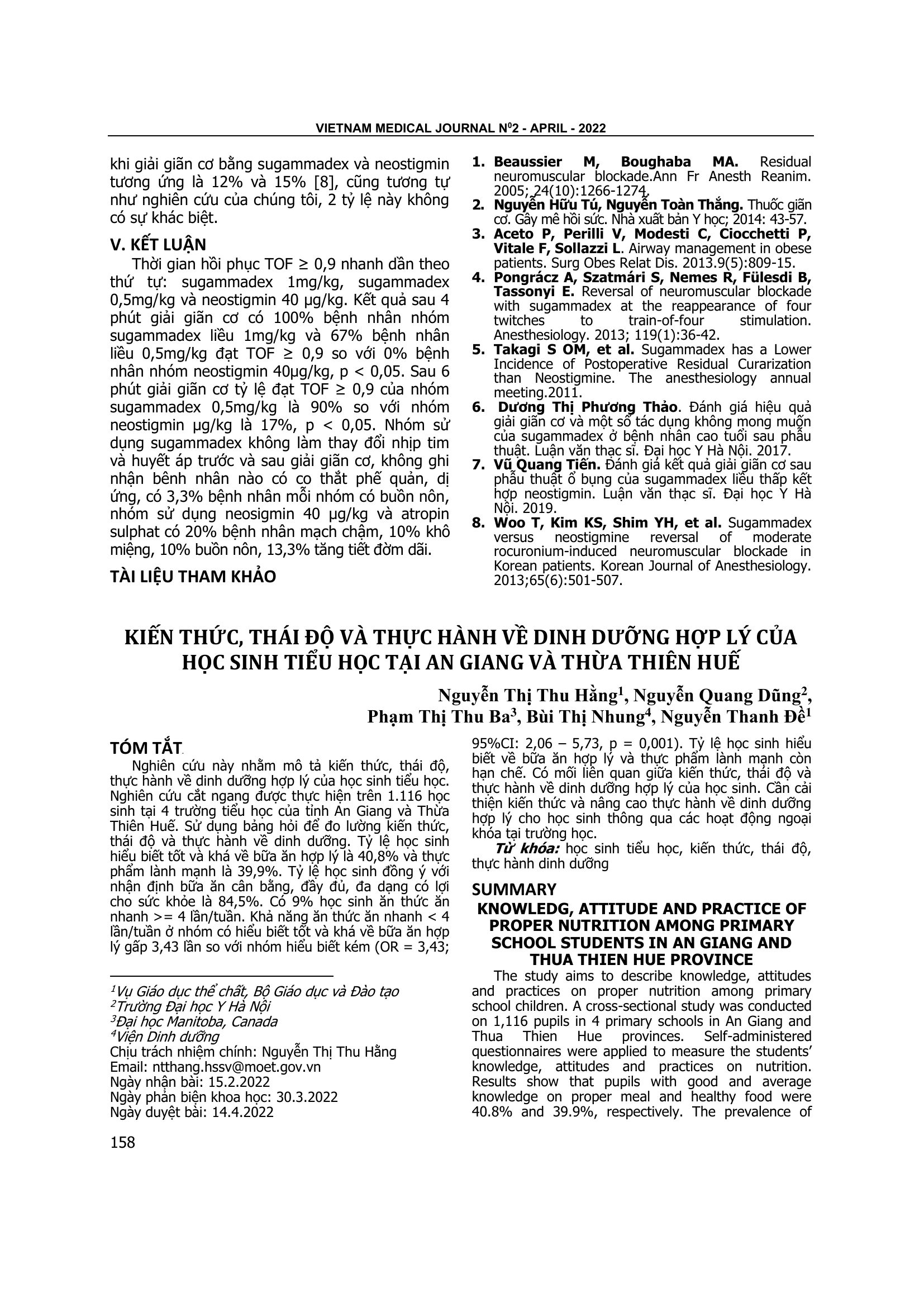 The study aims to describe knowledge, attitudes and practices on proper nutrition among primary school children. A cross-sectional study was conducted on 1,116 pupils in 4 primary schools in An Giang and Thua Thien Hue provinces. Self-administered questionnaires were applied to measure the students’ knowledge, attitudes and practices on nutrition. Results show that pupils with good and average knowledge on proper meal and healthy food were 40.8% and 39.9%, respectively. The prevalence of subjects agreeing with the statement that a balanced, adequate and varied meal is beneficial to health was 84.5%. Pupils who had fast-food equal or more than 4 times per week were 9% of the sample. Pupils with good and average knowledge on proper meal were 3.43 times more likely to have fast-food less than 4 times per week than those with poor knowledge (OR=3.43, 95% CI= 2.06 – 5.73, p=.0001). Pupils’ knowledge on proper meal and healthy food is still limited. There is a relationship between students’ practices and their knowledge and attitudes on proper nutrition. It is necessary to improve the knowledge and practice of proper nutrition for pupil through extracurricular activities at school.