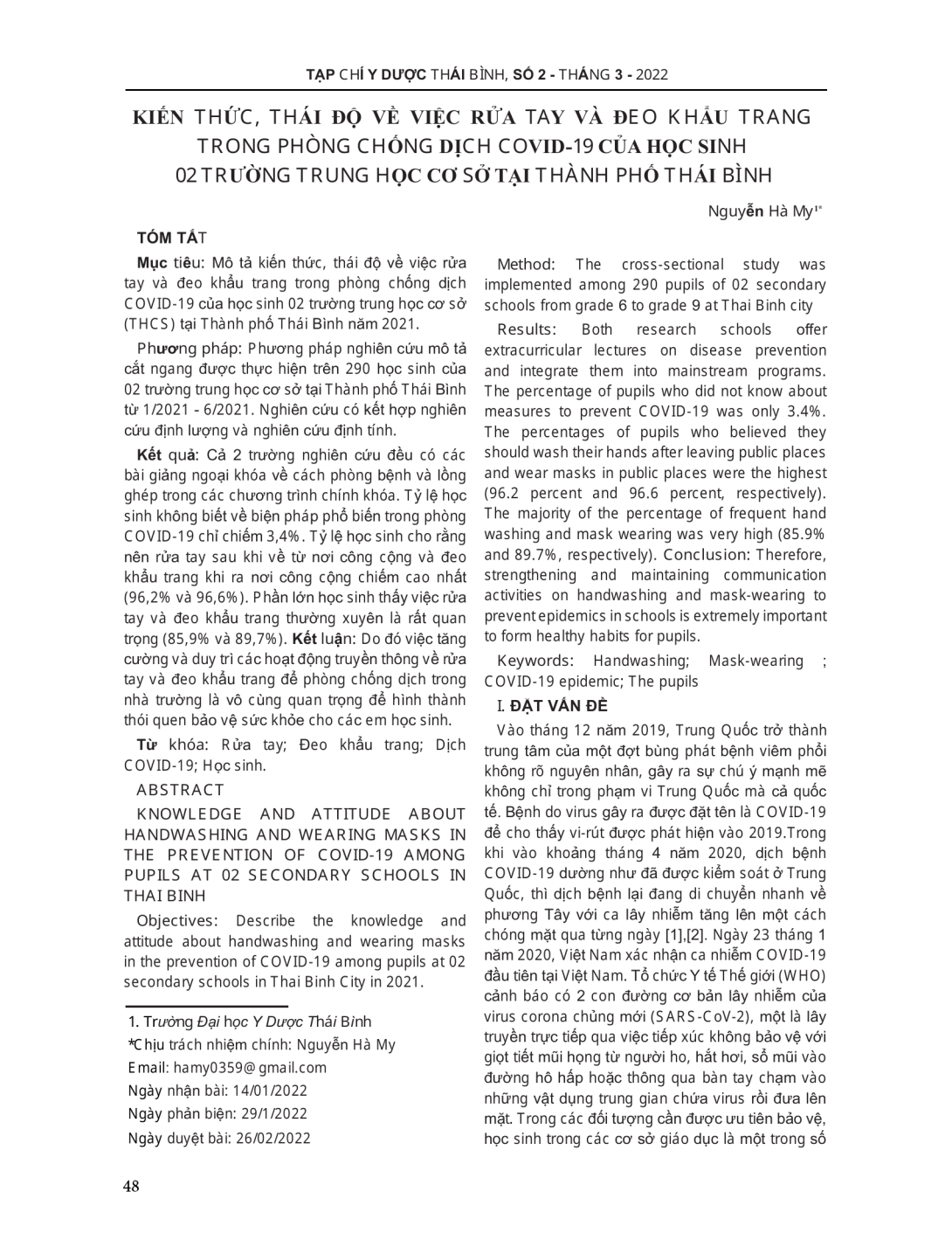 Describe the knowledge and attitude about handwashing and wearing masks in the prevention of COVID-19 among pupils at 02 secondary schools in Thai Binh City in 2021. The cross-sectional study was implemented among 290 pupils of 02 secondary schools from grade 6 to grade 9 at Thai Binh city Results: Both research schools offer extracurricular lectures on disease prevention and integrate them into mainstream programs. The percentage of pupils who did not know about measures to prevent COVID-19 was only 3.4%. The percentages of pupils who believed they should wash their hands after leaving public places and wear masks in public places were the highest (96.2 percent and 96.6 percent, respectively). The majority of the percentage of frequent hand washing and mask wearing was very high (85.9% and 89.7%, respectively). Conclusion: Therefore, strengthening and maintaining communication activities on handwashing and mask-wearing to prevent epidemics in schools is extremely important to form healthy habits for pupils. Keywords: Handwashing; Mask-wearing ; COVID-19 epidemic; The pupils