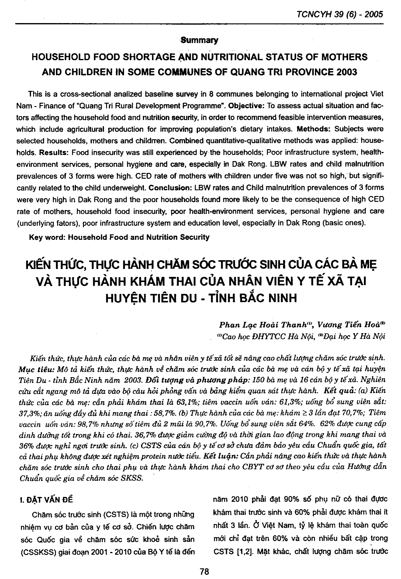 Mô tả kiến thức, thực hành chăm sóc trước sinh của các bà mẹ và cán bộ y tế xã tại huyện Tiên Du, tỉnh Bắc Ninh trong năm 2003. Phương pháp tiến hành nghiên cứu dựa vào bộ câu hỏi phỏng vấn và bảng kiểm tra quan sát thực hành.