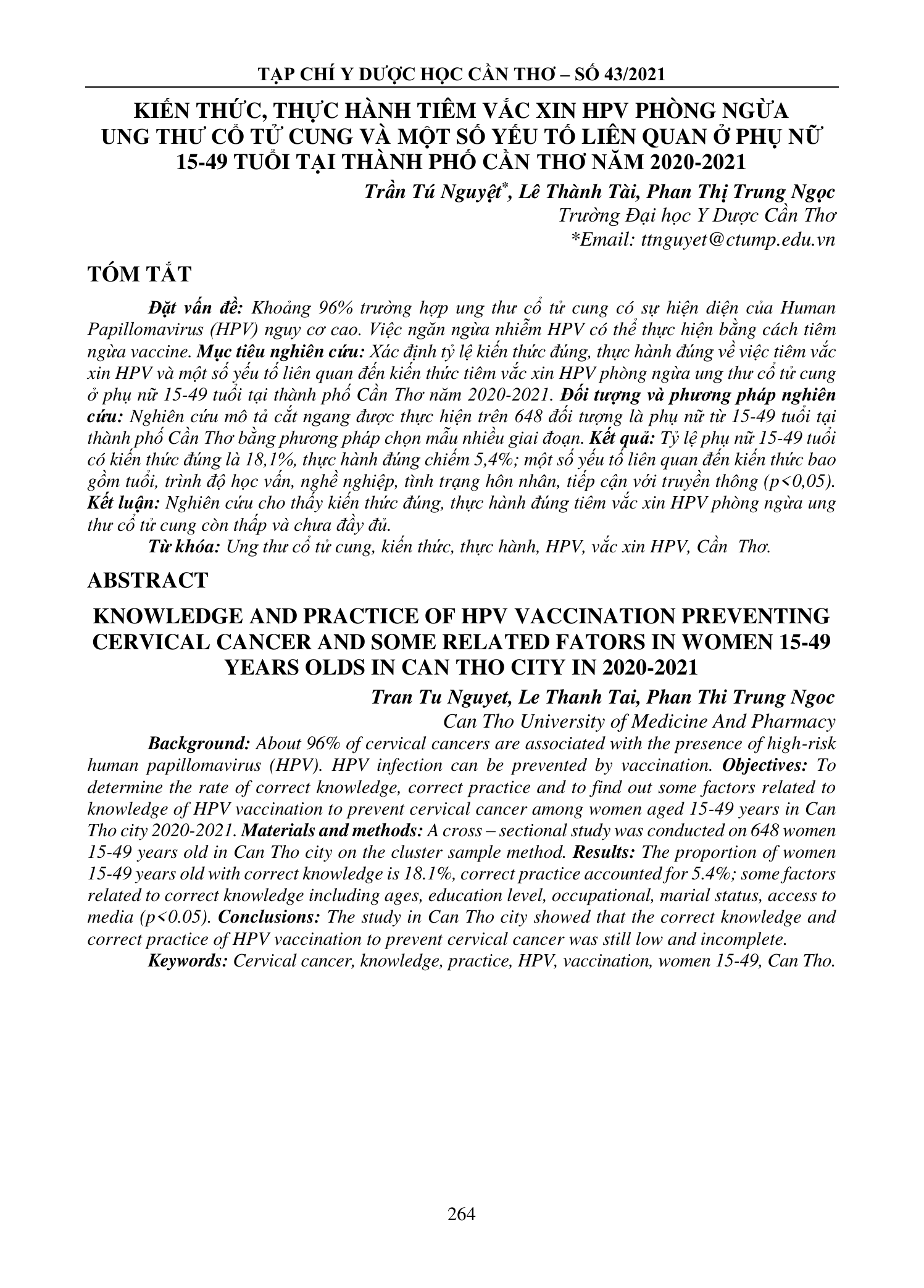 Khoảng 96% trường hợp ung thư cổ tử cung có sự hiện diện của Human Papillomavirus (HPV) nguy cơ cao. Việc ngăn ngừa nhiễm HPV có thể thực hiện bằng cách tiêm ngừa vaccine. Mục tiêu nghiên cứu: Xác định tỷ lệ kiến thức đúng, thực hành đúng về việc tiêm vắc xin HPV và một số yếu tố liên quan đến kiến thức tiêm vắc xin HPV phòng ngừa ung thư cổ tử cung ở phụ nữ 15-49 tuổi tại thành phố Cần Thơ năm 2020-2021. Đối tượng và phương pháp nghiên cứu: Nghiên cứu mô tả cắt ngang được thực hiện trên 648 đối tượng là phụ nữ từ 15-49 tuổi tại thành phố Cần Thơ bằng phương pháp chọn mẫu nhiều giai đoạn. Kết quả: Tỷ lệ phụ nữ 15-49 tuổi có kiến thức đúng là 18,1%, thực hành đúng chiếm 5,4%; một số yếu tố liên quan đến kiến thức bao gồm tuổi, trình độ học vấn, nghề nghiệp, tình trạng hôn nhân, tiếp cận với truyền thông (p<0,05). Kết luận: Nghiên cứu cho thấy kiến thức đúng, thực hành đúng tiêm vắc xin HPV phòng ngừa ung thư cổ tử cung còn thấp và chưa đầy đủ.