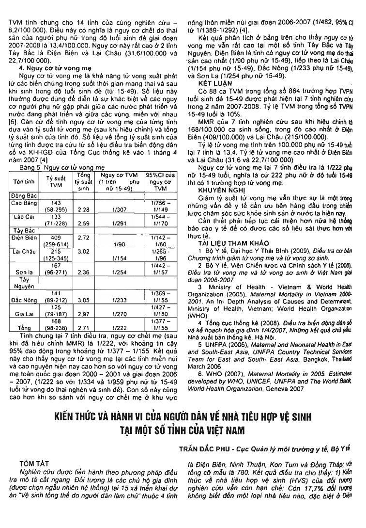 The study was conducted according to the cross-sectional descriptive method. The study subjects consisted of householders who were selected by a systematic random method in 15 comunes under the Community-led Total Sanitation project in 5 provinces including Dien Bien, Ninh Thuan, Kon Tum and Dong Thap, with the sample size of 780. The study results show that: 1) The knowledge of interviewees on sanitary latrines was still limited: Still 17.7 percent of respondents could not name any latrines, especially in Dien Bien. 15 percent of respondents did not know that open defecation would affect health; only around 20 percent of those knew that open defecation would affect air and water sources. 27.4 percent of respondents could not name any diseases as the consequences of direct contact with human feces. 59.6 percent of interviewees did not know or reported that the partially financing support policy for the poor to build latrines was not applied at their localities. 2) Regarding behaviors on using latrines: 80.4 percent of households had latrines, but only 22.7 percent of those were considered as sanitary latrines meeting the standard on construction, 18.1 percent of those meeting both two standards on construction and usage, maintenance according to the Decision No.08/2005lQD-BYT, this was found the highest in Dong Thap (59.6 percent) and the lowest in Kon Tum (8.8 percent). Among the households without latrines, 73.9 percent of those were used to urinate and defecate in gardens, forests and fields; 8.5 percent did at ponds, rivers and streams; and 19 percent had to use the neighbours' latrines.