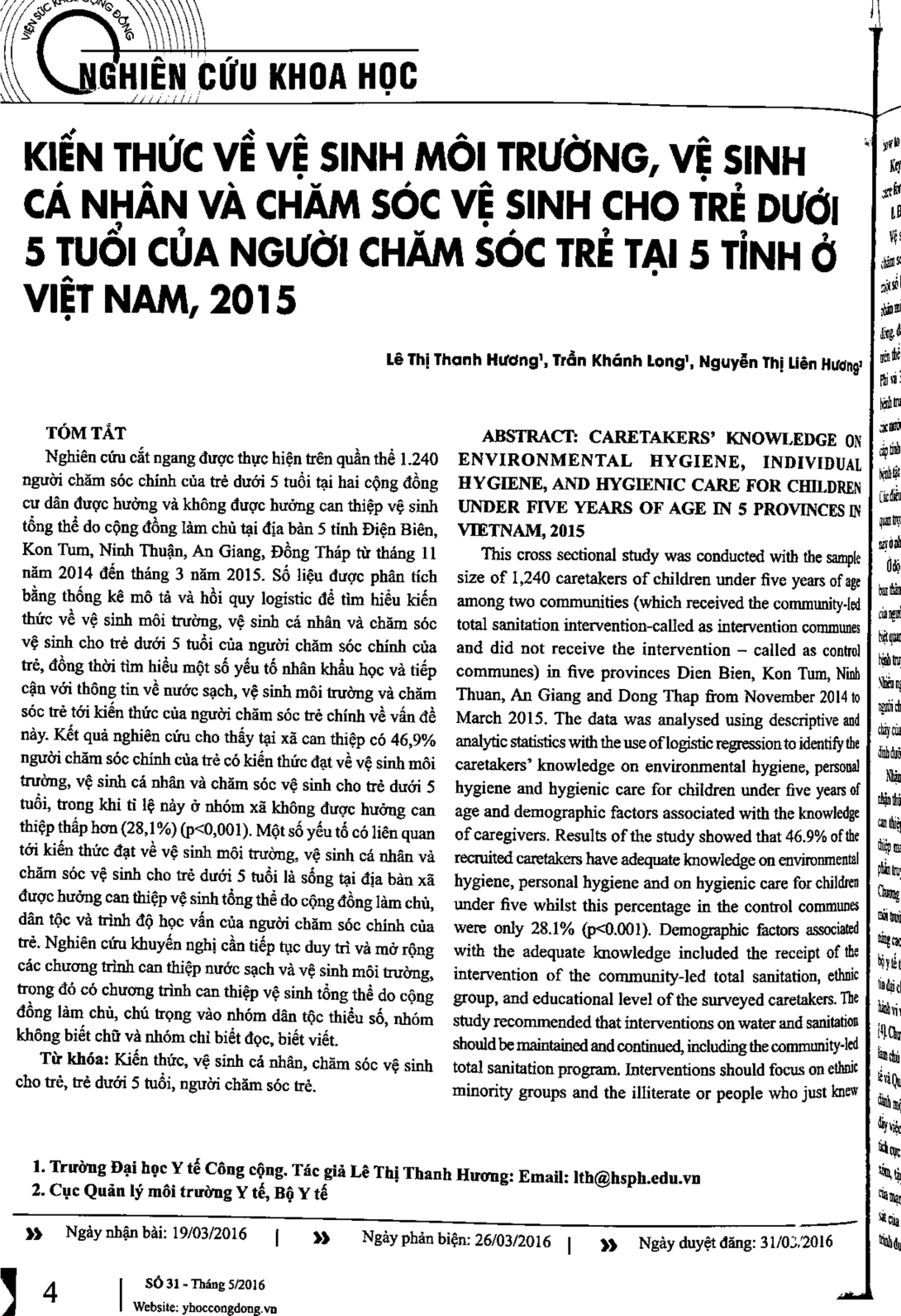 Kiến thức về vệ sinh môi trường, vệ sinh cá nhân và chăm sóc vệ sinh cho trẻ dưới 5 tuổi của người chăm sóc trẻ tại 5 tỉnh ở Việt Nam năm 2015