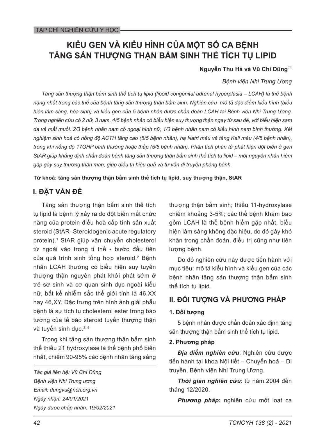 Tăng sản thượng thận bẩm sinh thể tích tụ lipid (lipoid congenital adrenal hyperplasia – LCAH) là thể bệnh nặng nhất trong các thể của bệnh tăng sản thượng thận bẩm sinh. Nghiên cứu mô tả đặc điểm kiểu hình (biểu hiện lâm sàng, hóa sinh) và kiểu gen của 5 bệnh nhân được chẩn đoán LCAH tại Bệnh viện Nhi Trung Ương. Trong nghiên cứu có 2 nữ, 3 nam. 4/5 bệnh nhân có biểu hiện suy thượng thận ngay từ sau đẻ, với biểu hiện sạm da và mất muối. 2/3 bệnh nhân nam có ngoại hình nữ, 1/3 bệnh nhân nam có kiểu hình nam bình thường. Xét nghiệm sinh hoá có nồng độ ACTH tăng cao (5/5 bệnh nhân), hạ Natri máu và tăng Kali máu (4/5 bệnh nhân), trong khi nồng độ 17OHP bình thường hoặc thấp (5/5 bệnh nhân). Phân tích phân tử phát hiện đột biến ở gen StAR giúp khẳng định chẩn đoán bệnh tăng sản thượng thận bẩm sinh thể tích tụ lipid – một nguyên nhân hiếm gặp gây suy thượng thận mạn, giúp điều trị hiệu quả và tư vấn di truyền phòng bệnh.