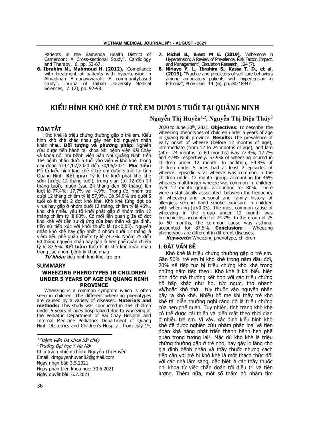 Khò khè là triệu chứng thường gặp ở trẻ em. Kiểu hình khò khè khác nhau gây nên bởi nguyên nhân khác nhau. Đối tượng và phương pháp: Nghiên cứu được tiến hành tại khoa Nhi bệnh viện Bãi Cháy và khoa nội nhi bệnh viện Sản Nhi Quảng Ninh trên 164 bệnh nhân dưới 5 tuổi vào viện vì khò khè trong giai đoạn từ 01/07/2020 đến 30/06/2021. Mục tiêu: Mô tả kiểu hình khò khè ở trẻ em dưới 5 tuổi tại tỉnh Quảng Ninh. Kết quả: Tỷ lệ trẻ khởi phát khò khè sớm (trước 12 tháng tuổi), trung gian (từ 12 đến 24 tháng tuổi), muộn (sau 24 tháng đến 60 tháng) lần lượt là 77,4%; 17,7% và 4,9%. Trong đó, nhóm trẻ dưới 12 tháng chiếm tỷ lệ 57,9%. Có 54,9% trẻ dưới 5 tuổi có ít nhất 2 đợt khò khè. Khò khè từng đợt do virus hay gặp ở nhóm dưới 12 tháng, chiếm tỷ lệ 46%, khò khè nhiều yếu tố khởi phát gặp ở nhóm trên 12 tháng chiếm tỷ lệ 80%. Có mối liên quan giữa số đợt khò khè với tiền sử dị ứng của bản thân và gia đình, tiền sử tiếp xúc với khói thuốc lá (p<0,05). Nguyên nhân khò khè hay gặp nhất ở nhóm dưới 12 tháng là viêm tiểu phế quản chiếm tỷ lệ 74,7%. Nhóm 25 đến 60 tháng nguyên nhân hay gặp là hen phế quản chiếm tỷ lệ 87,5%. Kết luận: Kiểu hình khò khè khác nhau trong các nhóm bệnh lý khác nhau
