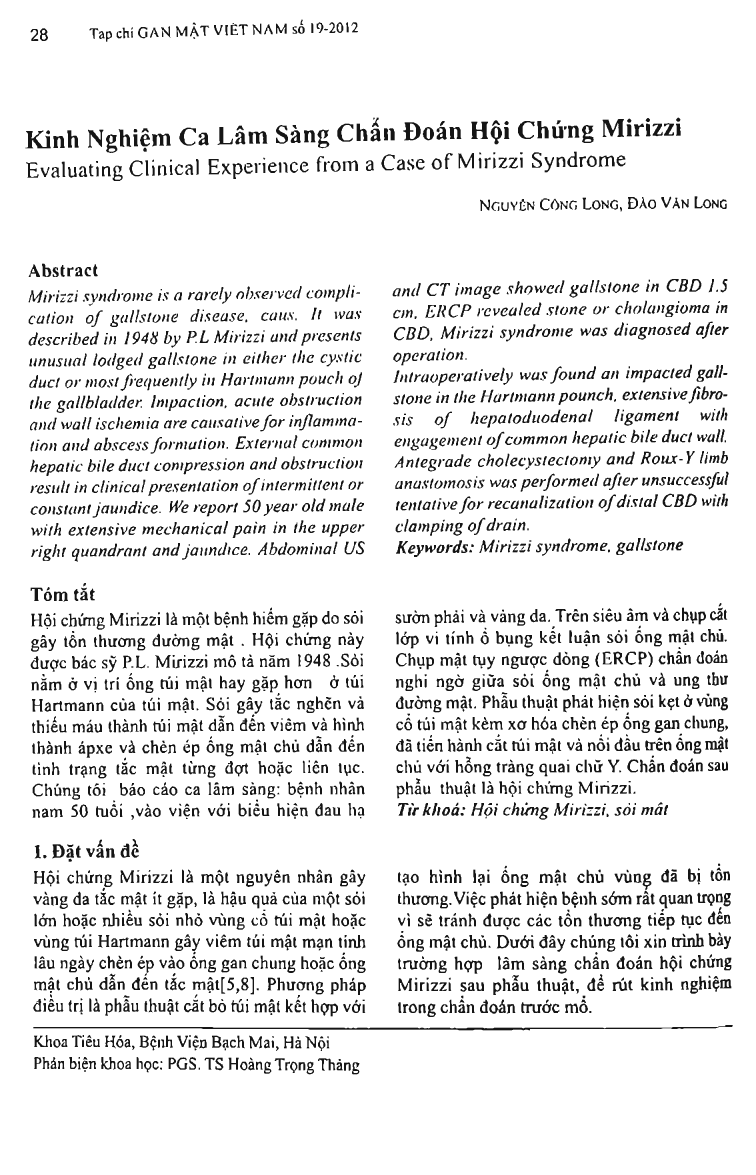 Mirizzi syndrome is a rarely observed complication of gallstone disease, caus. It was described in 1948 by P.L Mirizzi and presents unusual lodged gallstone in either the cystic duct or most frequently in Hartmann pouch oj the gallbladder. Impaction, acute obstruction and wall ischemia are causative for inflammation and abscess formation. External common hepatic bile duct compression and obstruction result in clinical presentation of intermittent or constant jaundice. The authors report 50 year old male with extensive mechanical pain in the upper right quandrant and jaundice. Abdominal US and CT image showed gallstone in CBD 1.5 cm, ERCP revealed stone or cholangioma in CBD, Mirizzi syndrome was diagnosed after operation. Intraoperatively was found an impacted gallstone in the Hartmann pounch, extensive fibrosis of hepatoduodenal ligament with engagement of common hepatic bile duct wall. Antegrade cholecystectomy and Roux-Y limb anastomosis was performed after unsuccessful tentative for recanalization of distal CBD with clamping of drain.