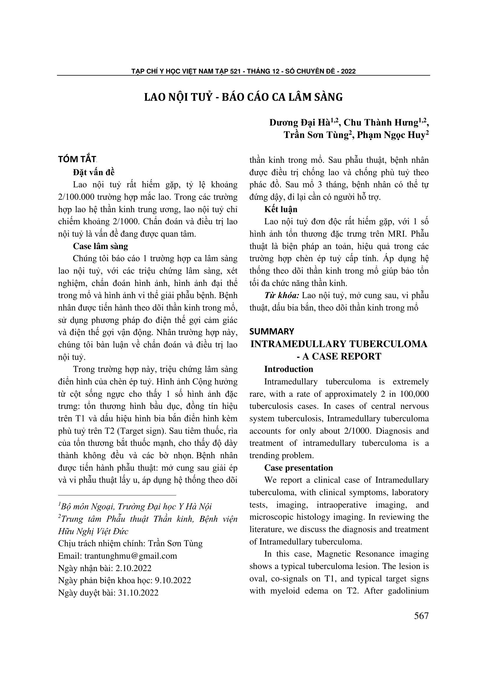 Lao nội tuỷ rất hiếm gặp, tỷ lệ khoảng 2/100.000 trường hợp mắc lao. Trong các trường hợp lao hệ thần kinh trung ương, lao nội tuỷ chỉ chiếm khoảng 2/1000. Chẩn đoán và điều trị lao nội tuỷ là vấn đề đang được quan tâm. Case lâm sàng Chúng tôi báo cáo 1 trường hợp ca lâm sàng lao nội tuỷ, với các triệu chứng lâm sàng, xét nghiệm, chẩn đoán hình ảnh, hình ảnh đại thể trong mổ và hình ảnh vi thể giải phẫu bệnh. Bệnh nhân được tiến hành theo dõi thần kinh trong mổ, sử dụng phương pháp đo điện thế gợi cảm giác và điện thế gợi vận động. Nhân trường hợp này, chúng tôi bàn luận về chẩn đoán và điều trị lao nội tuỷ. Trong trường hợp này, triệu chứng lâm sàng điển hình của chèn ép tuỷ. Hình ảnh Cộng hưởng từ cột sống ngực cho thấy 1 số hình ảnh đặc trưng: tổn thương hình bầu dục, đồng tín hiệu trên T1 và dấu hiệu hình bia bắn điển hình kèm phù tuỷ trên T2 (Target sign). Sau tiêm thuốc, rìa của tổn thương bắt thuốc mạnh, cho thấy độ dày thành không đều và các bờ nhọn. Bệnh nhân được tiến hành phẫu thuật: mở cung sau giải ép và vi phẫu thuật lấy u, áp dụng hệ thống theo dõi thần kinh trong mổ. Sau phẫu thuật, bệnh nhân được điều trị chống lao và chống phù tuỷ theo phác đồ. Sau mổ 3 tháng, bệnh nhân có thể tự đứng dậy, đi lại cần có người hỗ trợ. Kết luận Lao nội tuỷ đơn độc rất hiếm gặp, với 1 số hình ảnh tổn thương đặc trưng trên MRI. Phẫu thuật là biện pháp an toản, hiệu quả trong các trường hợp chèn ép tuỷ cấp tính. Áp dụng hệ thống theo dõi thần kinh trong mổ giúp bảo tổn tối đa chức năng thần kinh.