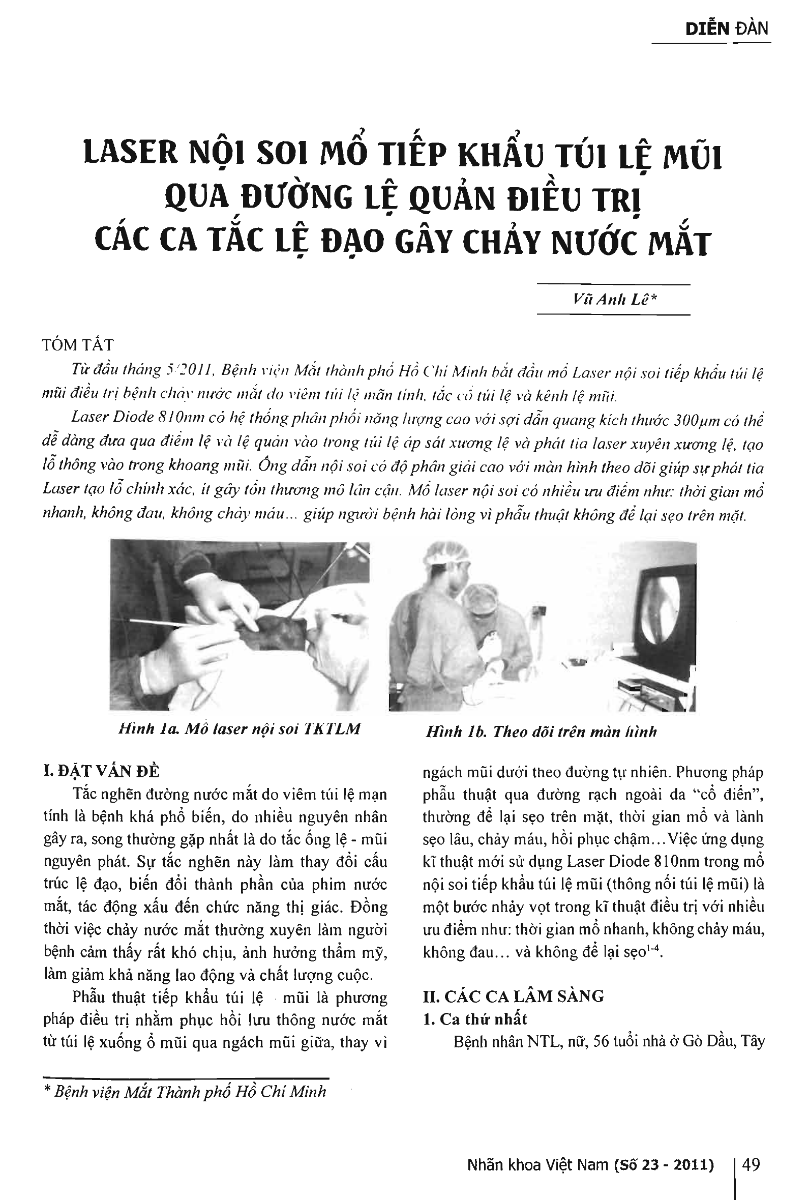 From early May 2011, many cases of nasolacrimal duct obstruction have been performed with Transcanalicular Diode laser - Assisted Dacryocystorhinostomy for treatment of epiphora due to chnonic dacryocystitis in Eye hospital of Ho chi minh city. Laser diode 810 nm with high power is used. A 300um semirigid laser fiberoptic is easily inserted at the lower punctum in the canaliculus up to the level of the lacrimal sac contacting with lacrimal bone. From this position, laser osteotomy is done through the lacrimal bone and nasal mucosa into the middle meatus. The high - resolution fiber-optic endoscope and the screen help the laser beam to make the fistula exactly with a very little damage of tissues around. The advantages of the endolaser DCR technique are: a short time, no pain, no bleeding, etc. and no scar on face. Patients are satisfied.