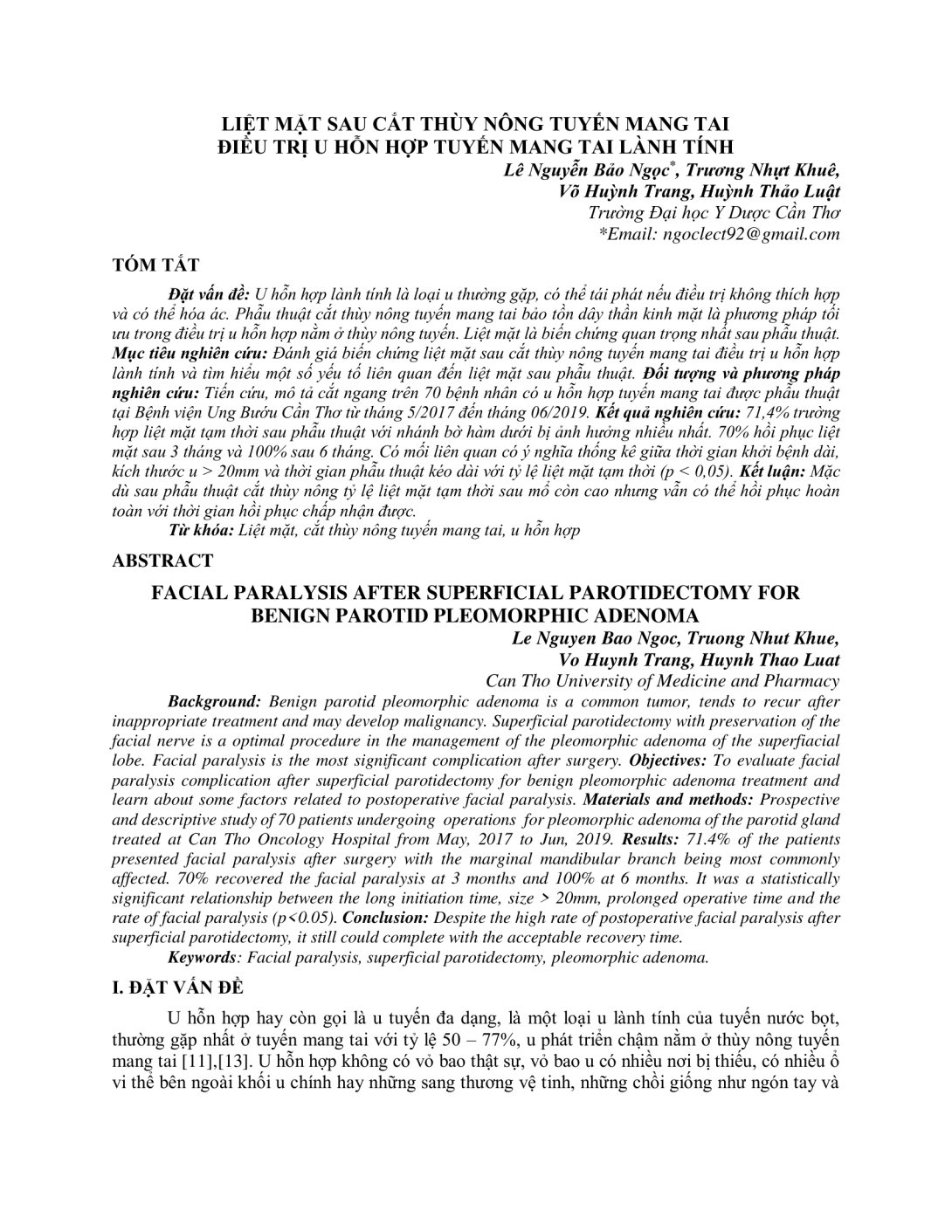 Đánh giá biến chứng liệt mặt sau cắt thùy nông tuyến mang tai điều trị u hỗn hợp lành tính và tìm hiểu một số yếu tố liên quan đến liệt mặt sau phẫu thuật. Tiến cứu, mô tả cắt ngang trên 70 bệnh nhân có u hỗn hợp tuyến mang tai được phẫu thuật tại Bệnh viện Ung Bướu Cần Thơ từ tháng 5/2017 đến tháng 06/2019. Kết quả nghiên cứu có 71,4% trường hợp liệt mặt tạm thời sau phẫu thuật với nhánh bờ hàm dưới bị ảnh hưởng nhiều nhất. 70% hồi phục liệt mặt sau 3 tháng và 100% sau 6 tháng. Có mối liên quan có ý nghĩa thống kê giữa thời gian khỏi bệnh dài, kích thước u > 20mm và thời gian phẫu thuật kéo dài với tỷ lệ liệt mặt tạm thời (p < 0,05).