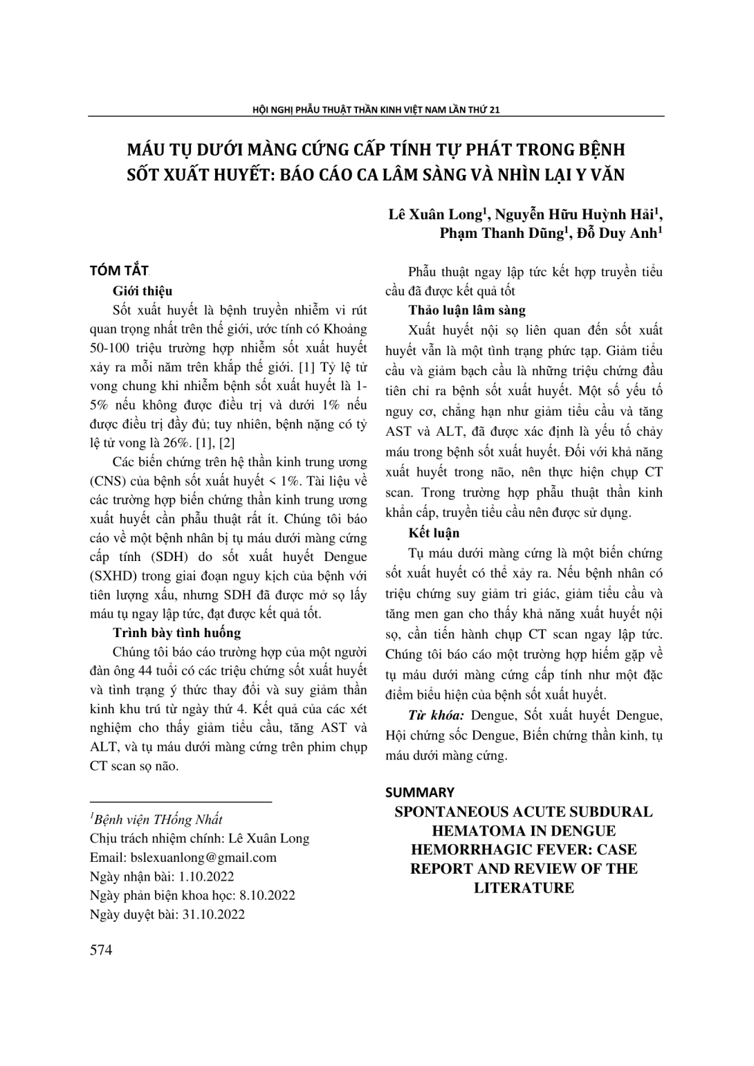Báo cáo trường hợp của một người đàn ông 44 tuổi có các triệu chứng sốt xuất huyết và tình trạng ý thức thay đổi và suy giảm thần kinh khu trú từ ngày thứ 4. Kết quả của các xét nghiệm cho thấy giảm tiểu cầu, tăng AST và ALT, và tụ máu dưới màng cứng trên phim chụp CT scan sọ não. Phẫu thuật ngay lập tức kết hợp truyền tiểu cầu đã được kết quả tốt Thảo luận lâm sàng Xuất huyết nội sọ liên quan đến sốt xuất huyết vẫn là một tình trạng phức tạp. Giảm tiểu cầu và giảm bạch cầu là những triệu chứng đầu tiên chỉ ra bệnh sốt xuất huyết. Một số yếu tố nguy cơ, chẳng hạn như giảm tiểu cầu và tăng AST và ALT, đã được xác định là yếu tố chảy máu trong bệnh sốt xuất huyết. Đối với khả năng xuất huyết trong não, nên thực hiện chụp CT scan. Trong trường hợp phẫu thuật thần kinh khẩn cấp, truyền tiểu cầu nên được sử dụng. Kết luận Tụ máu dưới màng cứng là một biến chứng sốt xuất huyết có thể xảy ra. Nếu bệnh nhân có triệu chứng suy giảm tri giác, giảm tiểu cầu và tăng men gan cho thấy khả năng xuất huyết nội sọ, cần tiến hành chụp CT scan ngay lập tức. Chúng tôi báo cáo một trường hợp hiếm gặp về tụ máu dưới màng cứng cấp tính như một đặc điểm biểu hiện của bệnh sốt xuất huyết.