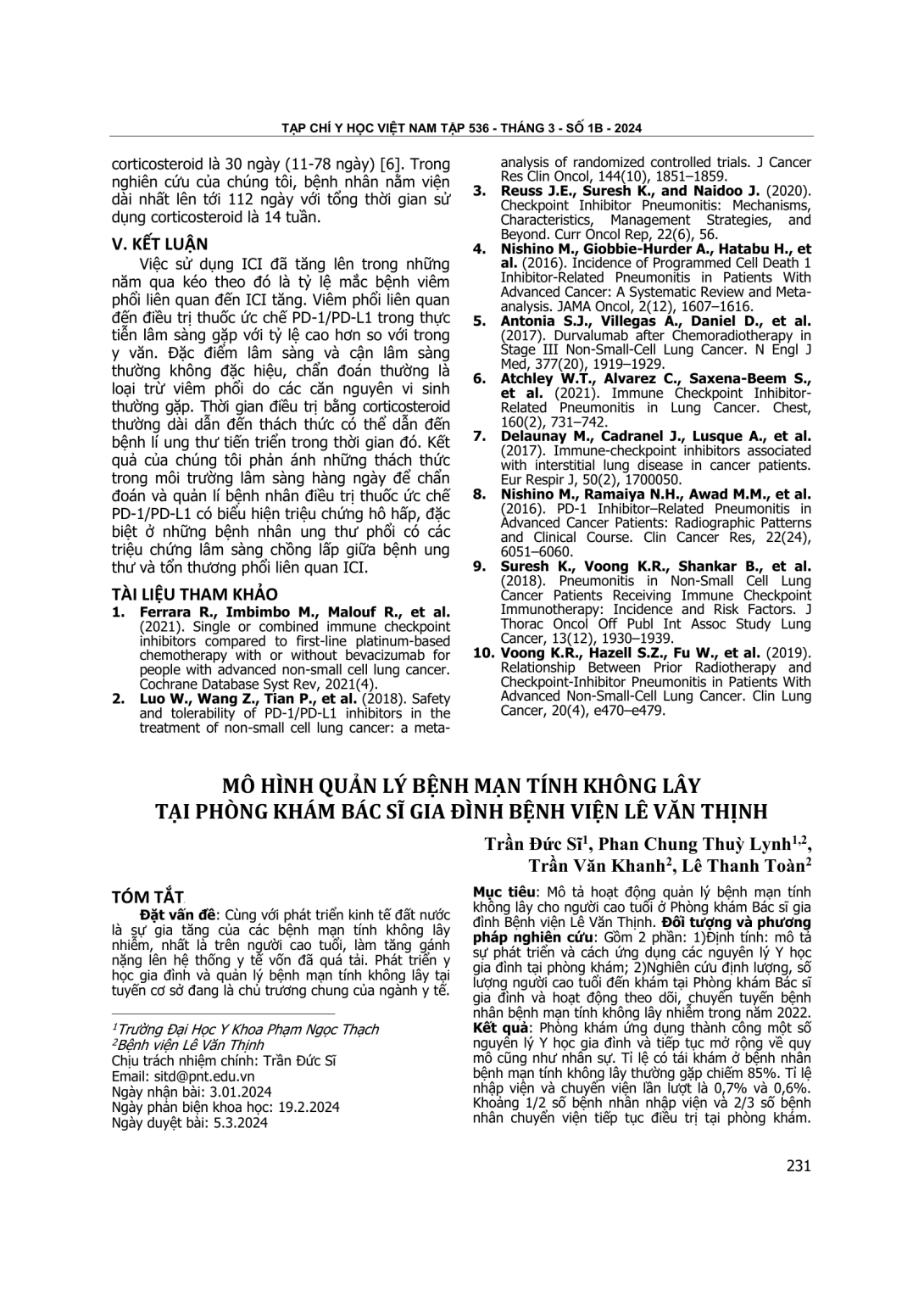 Mô tả hoạt động quản lý bệnh mạn tính không lây cho người cao tuổi ở Phòng khám Bác sĩ gia đình Bệnh viện Lê Văn Thịnh. Đối tượng và phương pháp nghiên cứu: Gồm 2 phần: 1)Định tính: mô tả sự phát triển và cách ứng dụng các nguyên lý Y học gia đình tại phòng khám; 2)Nghiên cứu định lượng, số lượng người cao tuổi đến khám tại Phòng khám Bác sĩ gia đình và hoạt động theo dõi, chuyển tuyến bệnh nhân bệnh mạn tính không lây nhiễm trong năm 2022. Kết quả: Phòng khám ứng dụng thành công một số nguyên lý Y học gia đình và tiếp tục mở rộng về quy mô cũng như nhân sự. Tỉ lệ có tái khám ở bệnh nhân bệnh mạn tính không lây thường gặp chiếm 85%. Tỉ lệ nhập viện và chuyển viện lần lượt là 0,7% và 0,6%. Khoảng 1/2 số bệnh nhân nhập viện và 2/3 số bệnh nhân chuyển viện tiếp tục điều trị tại phòng khám. Phần lớn bệnh nhân đạt mục tiêu điều trị. Kết luận: Mô hình quản lý bệnh mạn tính không lây thường gặp cho người cao tuổi ở Phòng khám Bác sĩ gia đình Bệnh viện Lê Văn Thịnh đang được triển khai hiệu quả. Tuy nhiên hoạt động phối hợp chuyển tuyến chưa được như kỳ vọng.