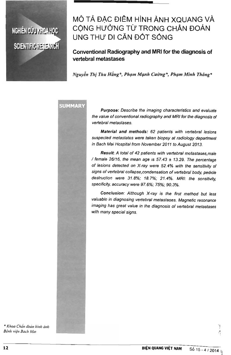 Mô tả đặc điểm hình ảnh Xquang và cộng hưởng từ trong chẩn đoán ung thư di căn đốt sống