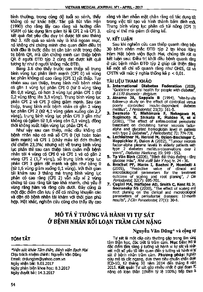 Mô tả ý tưởng và hành vi tự sát ở bệnh nhân rối loạn trầm cảm nặng theo tiêu chuẩn chẩn đoán ICD-10 từ 10/2014 đến 8/2015. Kết quả cho thấy tự sát gặp nhiều ở giai đoạn trầm cảm năng có loạn thần (100 phần trăm), tiếp theo là rối loạn trầm cảm tái diễn có loạn thần chiếm 88,9 phần trăm. Triệu chứng đặc trưng cho trầm cảm nặng có vai trò thúc đẩy tự sát như cảm xúc buồn rầu, bi quan, chán nản, mất hy vọng gặp ở 100 phần trăm bệnh nhân. Nguy cơ của tự sát liên quan đến yếu tố như bệnh trầm cảm, yếu tố về tâm lý xã hội và các yếu tố liên quan ngăn ngừa tự sát.