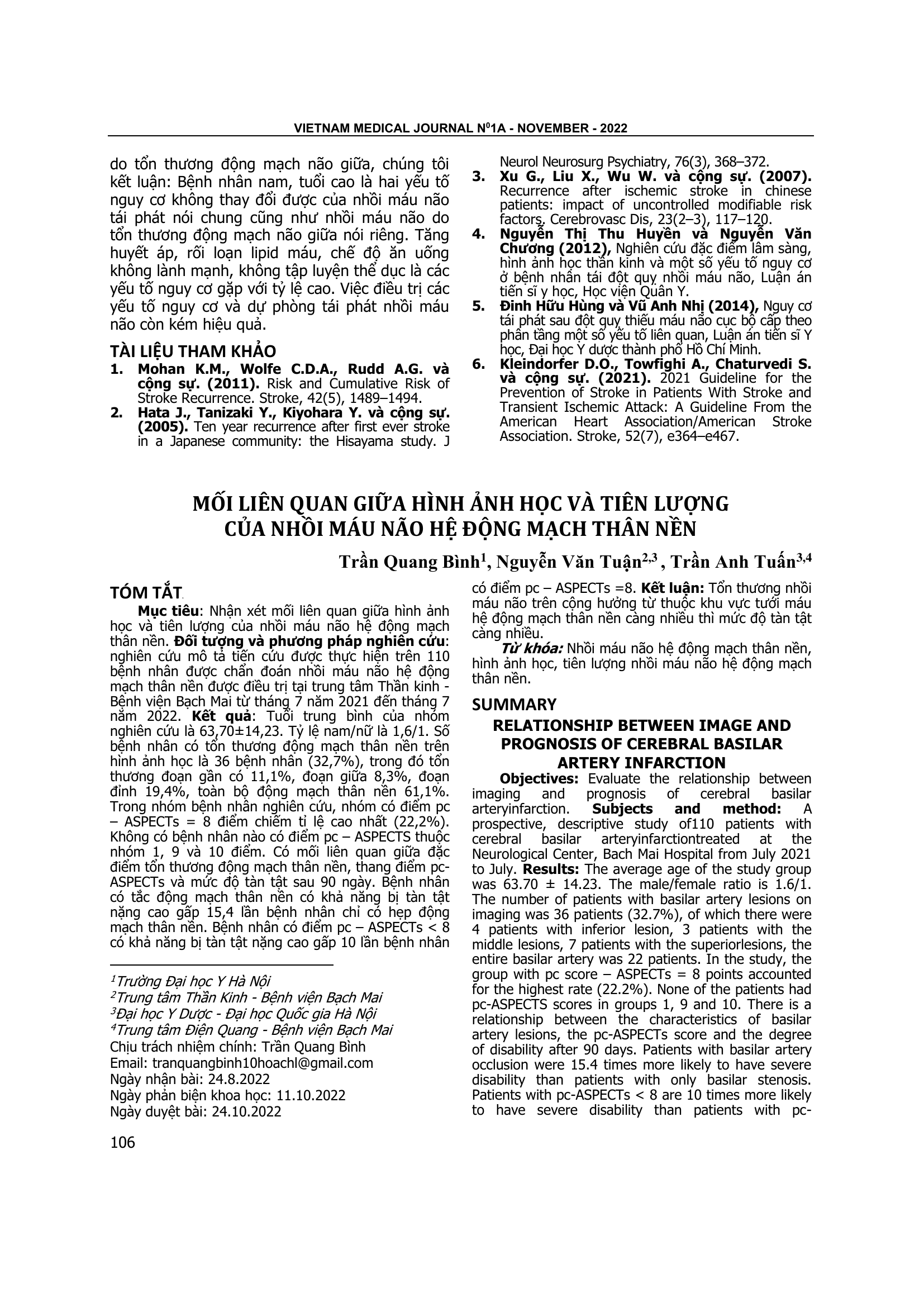 Nhận xét mối liên quan giữa hình ảnh học và tiên lượng của nhồi máu não hệ động mạch thân nền. Đối tượng và phương pháp nghiên cứu: nghiên cứu mô tả tiến cứu được thực hiện trên 110 bệnh nhân được chẩn đoán nhồi máu não hệ động mạch thân nền được điều trị tại trung tâm Thần kinh - Bệnh viện Bạch Mai từ tháng 7 năm 2021 đến tháng 7 năm 2022. Kết quả: Tuổi trung bình của nhóm nghiên cứu là 63,70±14,23. Tỷ lệ nam/nữ là 1,6/1. Số bệnh nhân có tổn thương động mạch thân nền trên hình ảnh học là 36 bệnh nhân (32,7%), trong đó tổn thương đoạn gần có 11,1%, đoạn giữa 8,3%, đoạn đỉnh 19,4%, toàn bộ động mạch thân nền 61,1%. Trong nhóm bệnh nhân nghiên cứu, nhóm có điểm pc – ASPECTs = 8 điểm chiếm tỉ lệ cao nhất (22,2%). Không có bệnh nhân nào có điểm pc – ASPECTS thuộc nhóm 1, 9 và 10 điểm. Có mối liên quan giữa đặc điểm tổn thương động mạch thân nền, thang điểm pc- ASPECTs và mức độ tàn tật sau 90 ngày. Bệnh nhân có tắc động mạch thân nền có khả năng bị tàn tật nặng cao gấp 15,4 lần bệnh nhân chỉ có hẹp động mạch thân nền. Bệnh nhân có điểm pc – ASPECTs < 8 có khả năng bị tàn tật nặng cao gấp 10 lần bệnh nhân có điểm pc – ASPECTs =8. Kết luận: Tổn thương nhồi máu não trên cộng hưởng từ thuộc khu vực tưới máu hệ động mạch thân nền càng nhiều thì mức độ tàn tật càng nhiều.