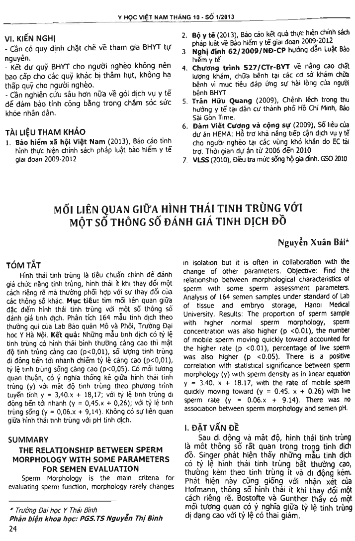 Sperm morphology is the main criteria for evaluating sperm function, morphology rarely changes in isolation but it is often in collaboration with the change of other parameters. Objectives: To find the relationship between morphological features of sperm with some sperm assessment parameters. Analysis of 164 semen samples under standard of Lab of tissue and embryo storage, Hanoi Medical University. Results: The proportion of sperm samples with higher normal sperm morphology, sperm concentration was also higher (p0.001), the number of mobile sperms moving quickly toward accounted for the higher rate (p0.001), the percentage of sperm was also higher (p0.05. There is a positive correlation with statistical significance between sperm morphology with sperm density. There was no association between sperm morphology and semen pH.