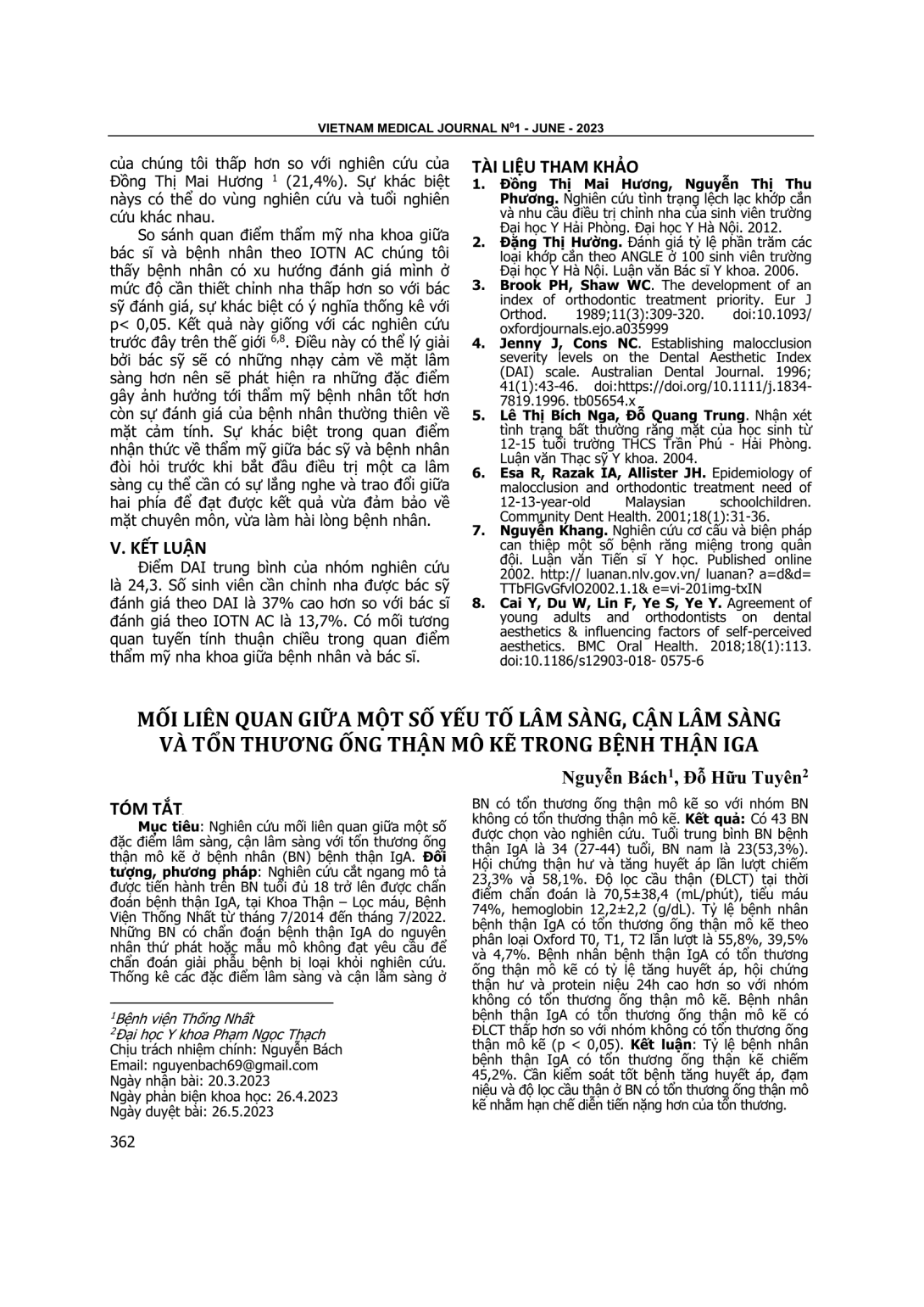 Nghiên cứu mối liên quan giữa một số đặc điểm lâm sàng, cận lâm sàng với tổn thương ống thận mô kẽ ở bệnh nhân (BN) bệnh thận IgA. Đối tượng, phương pháp: Nghiên cứu cắt ngang mô tả được tiến hành trên BN tuổi đủ 18 trở lên được chẩn đoán bệnh thận IgA, tại Khoa Thận – Lọc máu, Bệnh Viện Thống Nhất từ tháng 7/2014 đến tháng 7/2022. Những BN có chẩn đoán bệnh thận IgA do nguyên nhân thứ phát hoặc mẫu mô không đạt yêu cầu để chẩn đoán giải phẫu bệnh bị loại khỏi nghiên cứu. Thống kê các đặc điểm lâm sàng và cận lâm sàng ở BN có tổn thương ống thận mô kẽ so với nhóm BN không có tổn thương thận mô kẽ. Kết quả: Có 43 BN được chọn vào nghiên cứu. Tuổi trung bình BN bệnh thận IgA là 34 (27-44) tuổi, BN nam là 23(53,3%). Hội chứng thận hư và tăng huyết áp lần lượt chiếm 23,3% và 58,1%. Độ lọc cầu thận (ĐLCT) tại thời điểm chẩn đoán là 70,5±38,4 (mL/phút), tiểu máu 74%, hemoglobin 12,2±2,2 (g/dL). Tỷ lệ bệnh nhân bệnh thận IgA có tổn thương ống thận mô kẽ theo phân loại Oxford T0, T1, T2 lần lượt là 55,8%, 39,5% và 4,7%. Bệnh nhân bệnh thận IgA có tổn thương ống thận mô kẽ có tỷ lệ tăng huyết áp, hội chứng thận hư và protein niệu 24h cao hơn so với nhóm không có tổn thương ống thận mô kẽ. Bệnh nhân bệnh thận IgA có tổn thương ống thận mô kẽ có ĐLCT thấp hơn so với nhóm không có tổn thương ống thận mô kẽ (p < 0,05). Kết luận: Tỷ lệ bệnh nhân bệnh thận IgA có tổn thương ống thận kẽ chiếm 45,2%. Cần kiểm soát tốt bệnh tăng huyết áp, đạm niệu và độ lọc cầu thận ở BN có tổn thương ống thận mô kẽ nhằm hạn chế diễn tiến nặng hơn của tổn thương.