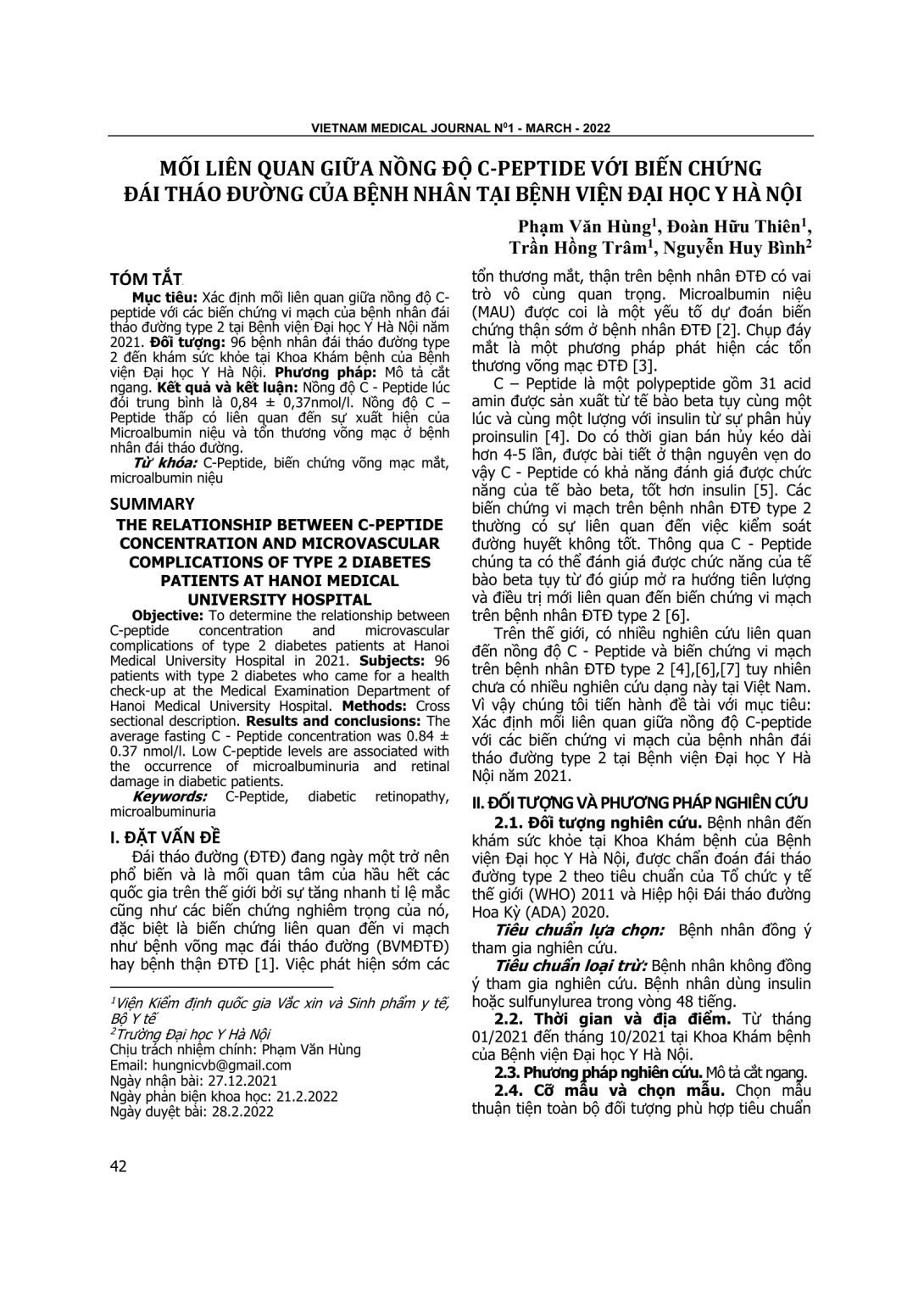 Xác định mối liên quan giữa nồng độ C-peptide với các biến chứng vi mạch của bệnh nhân đái tháo đường type 2 tại Bệnh viện Đại học Y Hà Nội năm 2021. Đối tượng: 96 bệnh nhân đái tháo đường type 2 đến khám sức khỏe tại Khoa Khám bệnh của Bệnh viện Đại học Y Hà Nội. Phương pháp: Mô tả cắt ngang. Kết quả và kết luận: Nồng độ C - Peptide lúc đói trung bình là 0,84 ± 0,37nmol/l. Nồng độ C – Peptide thấp có liên quan đến sự xuất hiện của Microalbumin niệu và tổn thương võng mạc ở bệnh nhân đái tháo đường.