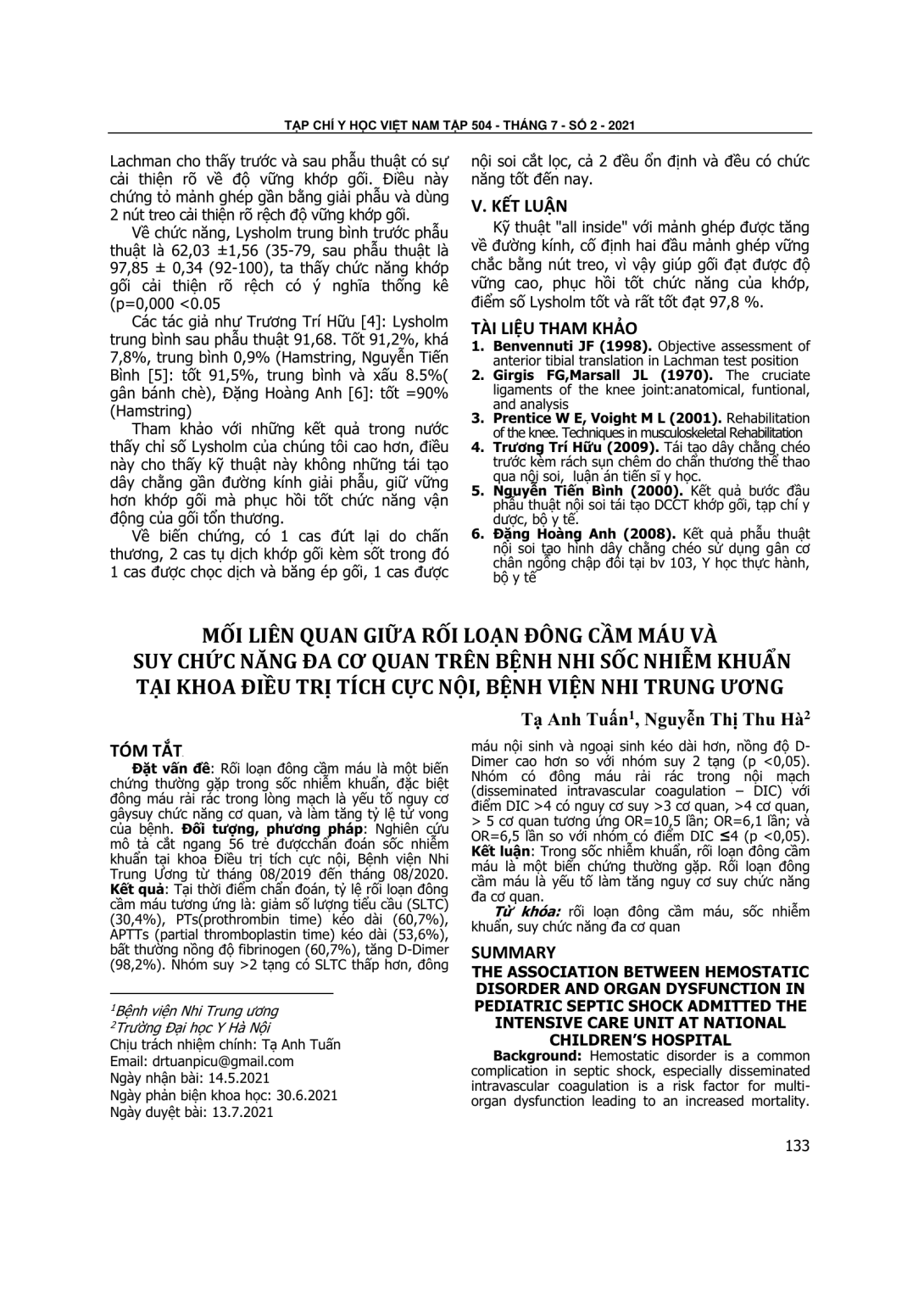 Rối loạn đông cầm máu là một biến chứng thường gặp trong sốc nhiễm khuẩn, đặc biệt đông máu rải rác trong lòng mạch là yếu tố nguy cơ gâysuy chức năng cơ quan, và làm tăng tỷ lệ tử vong của bệnh. Đối tượng, phương pháp: Nghiên cứu mô tả cắt ngang 56 trẻ đượcchẩn đoán sốc nhiễm khuẩn tại khoa Điều trị tích cực nội, Bệnh viện Nhi Trung Ương từ tháng 08/2019 đến tháng 08/2020. Kết quả: Tại thời điểm chẩn đoán, tỷ lệ rối loạn đông cầm máu tương ứng là: giảm số lượng tiểu cầu (SLTC) (30,4%), PTs(prothrombin time) kéo dài (60,7%), APTTs (partial thromboplastin time) kéo dài (53,6%), bất thường nồng độ fibrinogen (60,7%), tăng D-Dimer (98,2%). Nhóm suy >2 tạng có SLTC thấp hơn, đông máu nội sinh và ngoại sinh kéo dài hơn, nồng độ DDimer cao hơn so với nhóm suy 2 tạng (p 4 có nguy cơ suy >3 cơ quan, >4 cơ quan, > 5 cơ quan tương ứng OR=10,5 lần; OR=6,1 lần; và OR=6,5 lần so với nhóm có điểm DIC ≤4 (p <0,05). Kết luận: Trong sốc nhiễm khuẩn, rối loạn đông cầm máu là một biến chứng thường gặp. Rối loạn đông cầm máu là yếu tố làm tăng nguy cơ suy chức năng đa cơ quan.