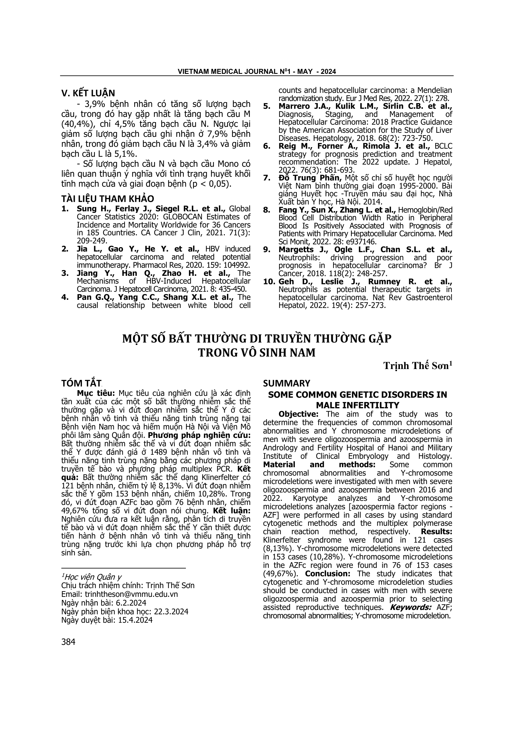 Mục tiêu của nghiên cứu là xác định tần xuất của các một số bất thường nhiễm sắc thể thường gặp và vi đứt đoạn nhiễm sắc thể Y ở các bệnh nhân vô tinh và thiểu năng tinh trùng nặng tại Bệnh viện Nam học và hiếm muộn Hà Nội và Viện Mô phôi lâm sàng Quân đội. Phương pháp nghiên cứu: Bất thường nhiễm sắc thể và vi đứt đoạn nhiễm sắc thể Y được đánh giá ở 1489 bệnh nhân vô tinh và thiểu năng tinh trùng nặng bằng các phương pháp di truyền tế bào và phương pháp multiplex PCR. Kết quả: Bất thường nhiễm sắc thể dạng Klinerfelter có 121 bệnh nhân, chiếm tỷ lệ 8,13%. Vi đứt đoạn nhiễm sắc thể Y gồm 153 bệnh nhân, chiếm 10,28%. Trong đó, vi đứt đoạn AZFc bao gồm 76 bệnh nhân, chiếm 49,67% tổng số vi đứt đoạn nói chung. Kết luận: Nghiên cứu đưa ra kết luận rằng, phân tích di truyền tế bào và vi đứt đoạn nhiễm sắc thể Y cần thiết được tiến hành ở bệnh nhân vô tinh và thiểu năng tinh trùng nặng trước khi lựa chọn phương pháp hỗ trợ sinh sản.