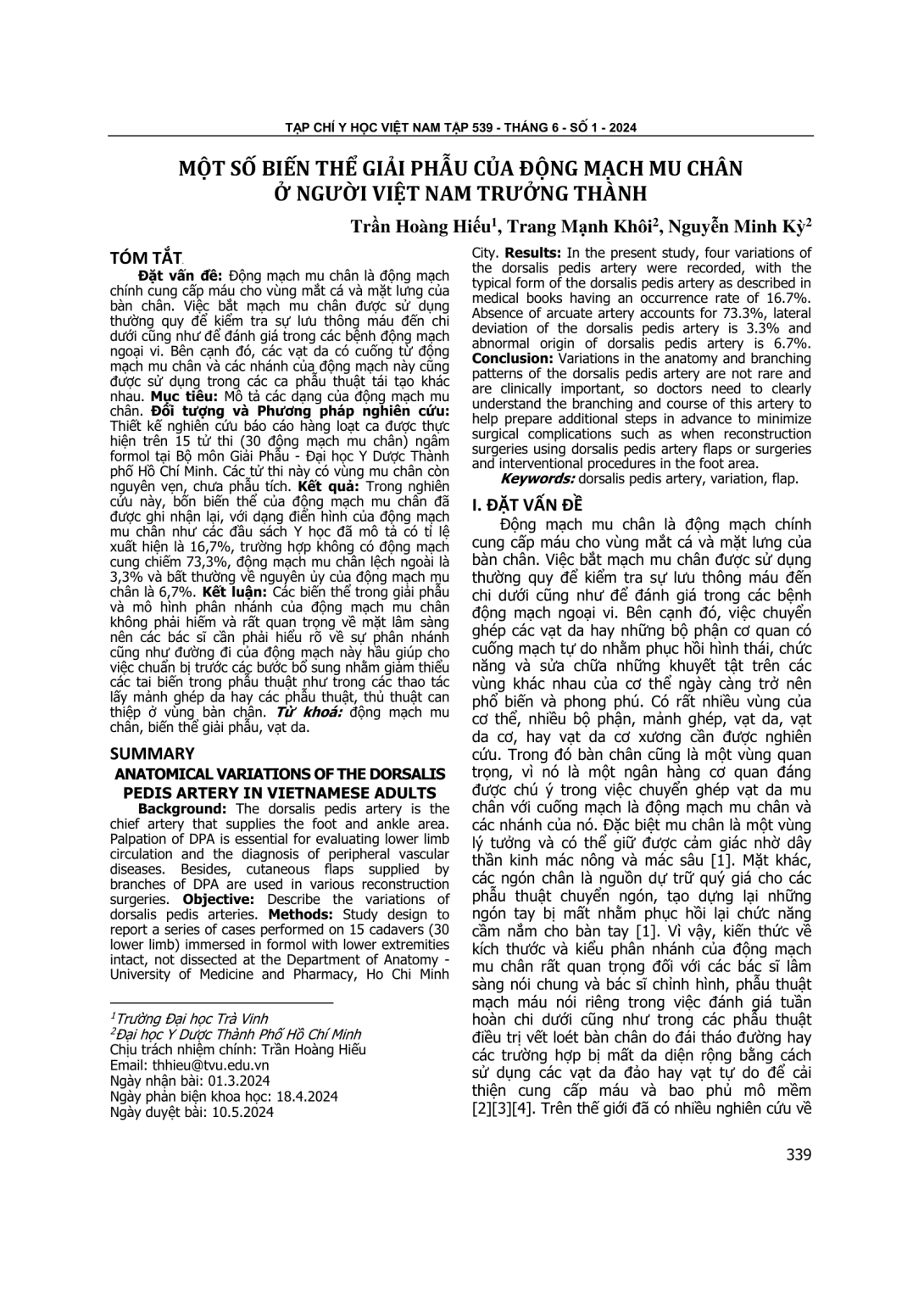 Động mạch mu chân là động mạch chính cung cấp máu cho vùng mắt cá và mặt lưng của bàn chân. Việc bắt mạch mu chân được sử dụng thường quy để kiểm tra sự lưu thông máu đến chi dưới cũng như để đánh giá trong các bệnh động mạch ngoại vi. Bên cạnh đó, các vạt da có cuống từ động mạch mu chân và các nhánh của động mạch này cũng được sử dụng trong các ca phẫu thuật tái tạo khác nhau. Mục tiêu: Mô tả các dạng của động mạch mu chân. Đối tượng và Phương pháp nghiên cứu: Thiết kế nghiên cứu báo cáo hàng loạt ca được thực hiện trên 15 tử thi (30 động mạch mu chân) ngâm formol tại Bộ môn Giải Phẫu - Đại học Y Dược Thành phố Hồ Chí Minh. Các tử thi này có vùng mu chân còn nguyên vẹn, chưa phẫu tích. Kết quả: Trong nghiên cứu này, bốn biến thể của động mạch mu chân đã được ghi nhận lại, với dạng điển hình của động mạch mu chân như các đầu sách Y học đã mô tả có tỉ lệ xuất hiện là 16,7%, trường hợp không có động mạch cung chiếm 73,3%, động mạch mu chân lệch ngoài là 3,3% và bất thường về nguyên ủy của động mạch mu chân là 6,7%. Kết luận: Các biến thể trong giải phẫu và mô hình phân nhánh của động mạch mu chân không phải hiếm và rất quan trọng về mặt lâm sàng nên các bác sĩ cần phải hiểu rõ về sự phân nhánh cũng như đường đi của động mạch này hầu giúp cho việc chuẩn bị trước các bước bổ sung nhằm giảm thiểu các tai biến trong phẫu thuật như trong các thao tác lấy mảnh ghép da hay các phẫu thuật, thủ thuật can thiệp ở vùng bàn chân.