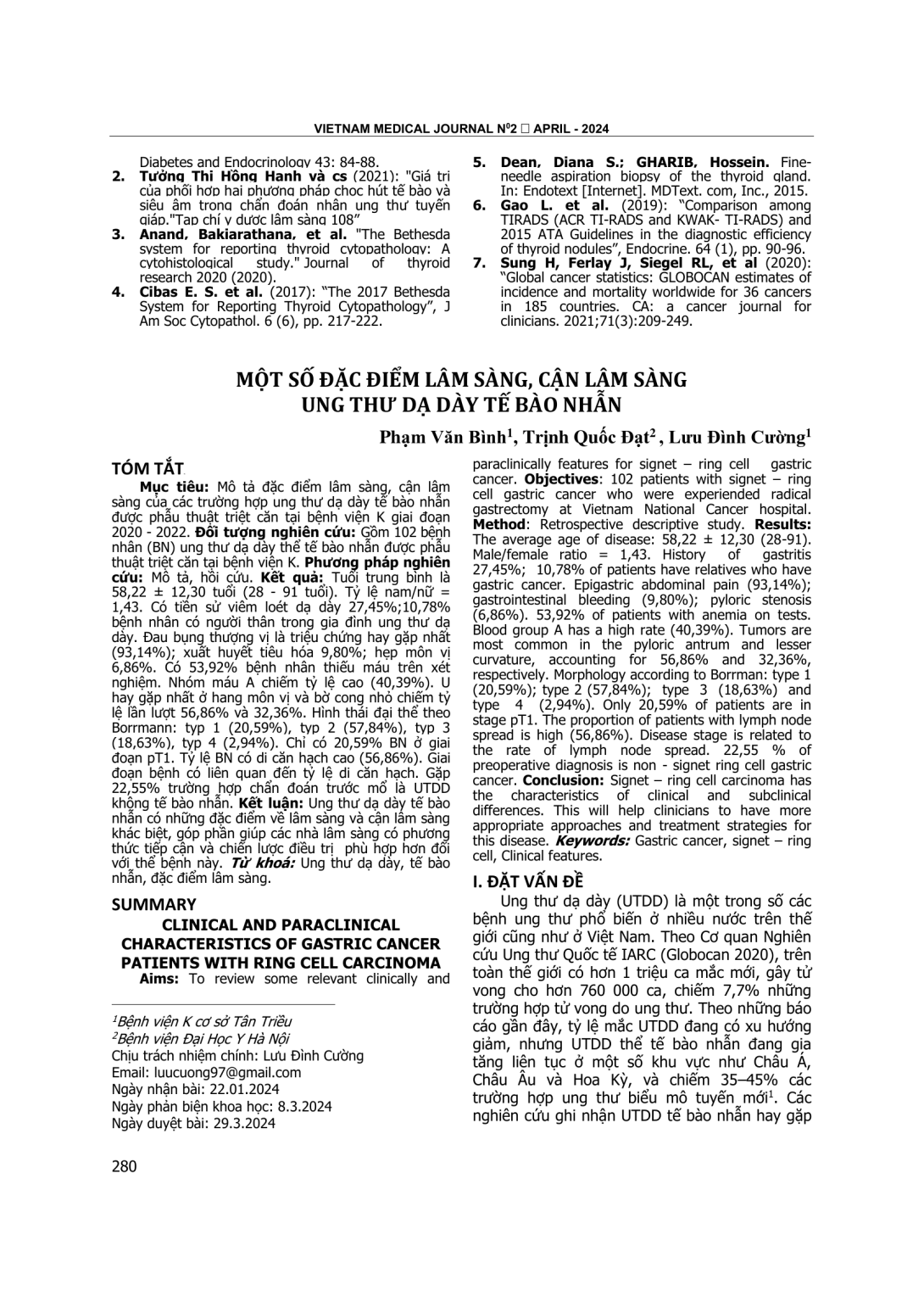 Mô tả đặc điểm lâm sàng, cận lâm sàng của các trường hợp ung thư dạ dày tế bào nhẫn được phẫu thuật triệt căn tại bệnh viện K giai đoạn 2020 - 2022. Đối tượng nghiên cứu: Gồm 102 bệnh nhân (BN) ung thư dạ dày thể tế bào nhẫn được phẫu thuật triệt căn tại bệnh viện K. Phương pháp nghiên cứu: Mô tả, hồi cứu. Kết quả: Tuổi trung bình là 58,22 ± 12,30 tuổi (28 - 91 tuổi). Tỷ lệ nam/nữ = 1,43. Có tiền sử viêm loét dạ dày 27,45%;10,78% bệnh nhân có người thân trong gia đình ung thư dạ dày. Đau bụng thượng vị là triệu chứng hay gặp nhất (93,14%); xuất huyết tiêu hóa 9,80%; hẹp môn vị 6,86%. Có 53,92% bệnh nhân thiếu máu trên xét nghiệm. Nhóm máu A chiếm tỷ lệ cao (40,39%). U hay gặp nhất ở hang môn vị và bờ cong nhỏ chiếm tỷ lệ lần lượt 56,86% và 32,36%. Hình thái đại thể theo Borrmann: typ 1 (20,59%), typ 2 (57,84%), typ 3 (18,63%), typ 4 (2,94%). Chỉ có 20,59% BN ở giai đoạn pT1. Tỷ lệ BN có di căn hạch cao (56,86%). Giai đoạn bệnh có liên quan đến tỷ lệ di căn hạch. Gặp 22,55% trường hợp chẩn đoán trước mổ là UTDD không tế bào nhẫn. Kết luận: Ung thư dạ dày tế bào nhẫn có những đặc điểm về lâm sàng và cận lâm sàng khác biệt, góp phần giúp các nhà lâm sàng có phương thức tiếp cận và chiến lược điều trị phù hợp hơn đối với thể bệnh này.