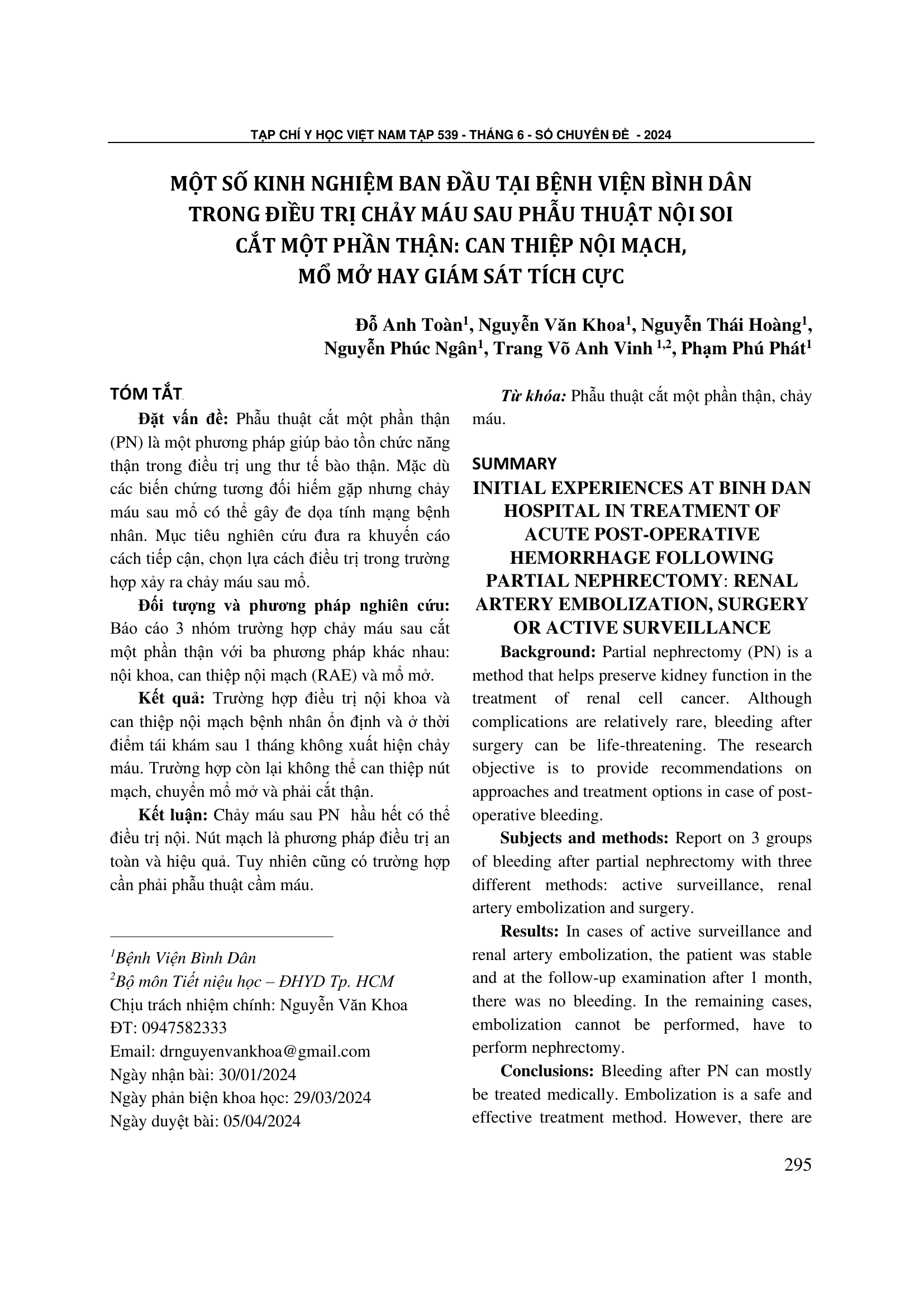 Phẫu thuật cắt một phần thận (PN) là một phương pháp giúp bảo tồn chức năng thận trong điều trị ung thư tế bào thận. Mặc dù các biến chứng tương đối hiếm gặp nhưng chảy máu sau mổ có thể gây đe dọa tính mạng bệnh nhân. Mục tiêu nghiên cứu đưa ra khuyến cáo cách tiếp cận, chọn lựa cách điều trị trong trường hợp xảy ra chảy máu sau mổ. Đối tượng và phương pháp nghiên cứu: Báo cáo 3 nhóm trường hợp chảy máu sau cắt một phần thận với ba phương pháp khác nhau: nội khoa, can thiệp nội mạch (RAE) và mổ mở. Kết quả: Trường hợp điều trị nội khoa và can thiệp nội mạch bệnh nhân ổn định và ở thời điểm tái khám sau 1 tháng không xuất hiện chảy máu. Trường hợp còn lại không thể can thiệp nút mạch, chuyển mổ mở và phải cắt thận. Kết luận: Chảy máu sau PN hầu hết có thể điều trị nội. Nút mạch là phương pháp điều trị an toàn và hiệu quả. Tuy nhiên cũng có trường hợp cần phải phẫu thuật cầm máu.