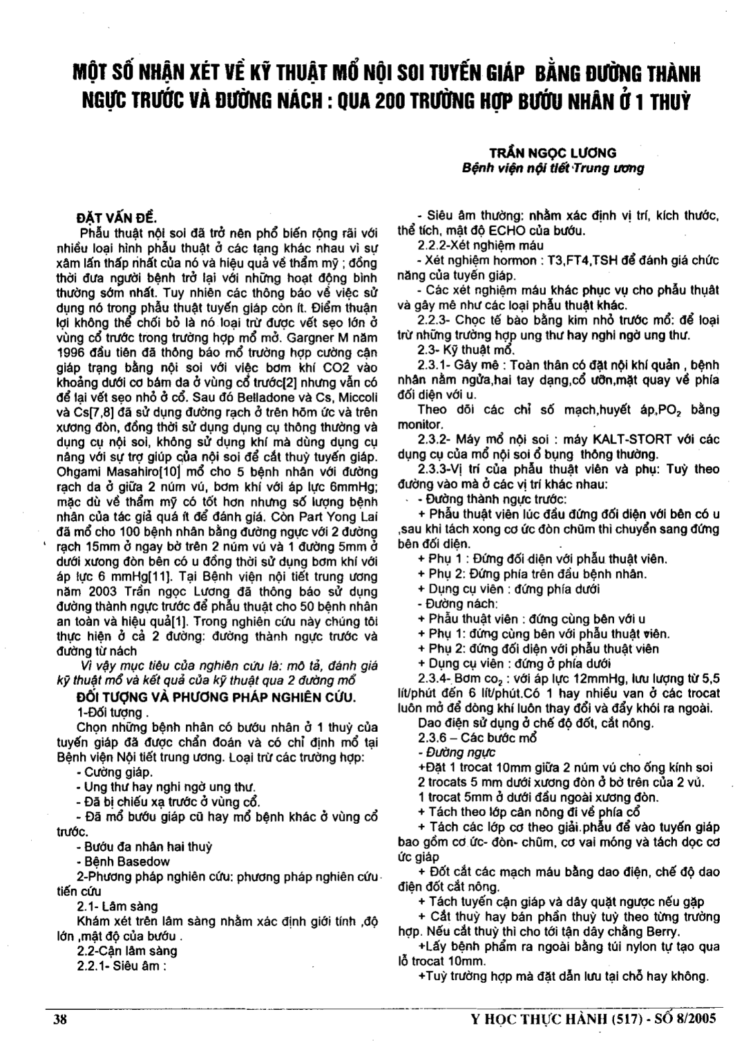 Một số nhận xét về kỹ thuật nội soi tuyến giáp bằng đường thành ngực và đường nách qua 200 trường hợp bướu nhân ở 1 thuỳ
